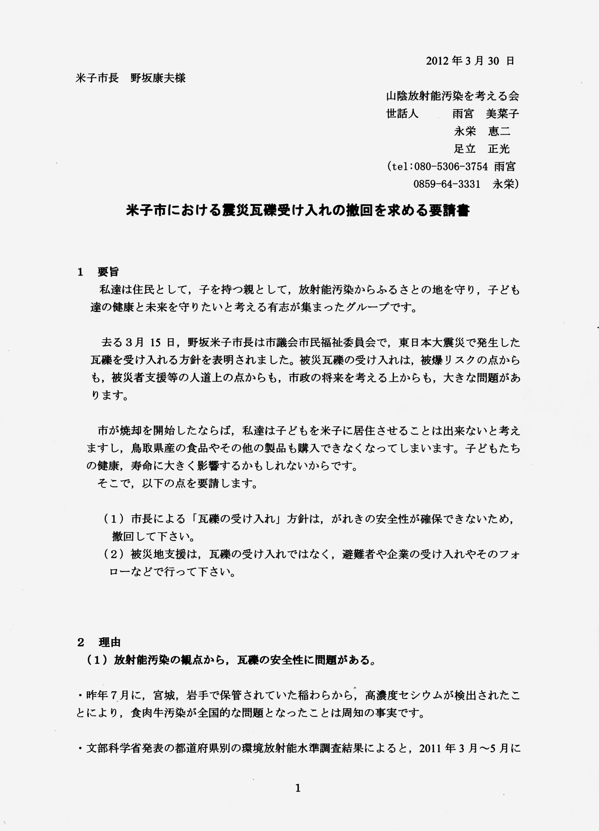被災地の報告、米子市のガレキ受け入れ問題について、島根原発のことについて