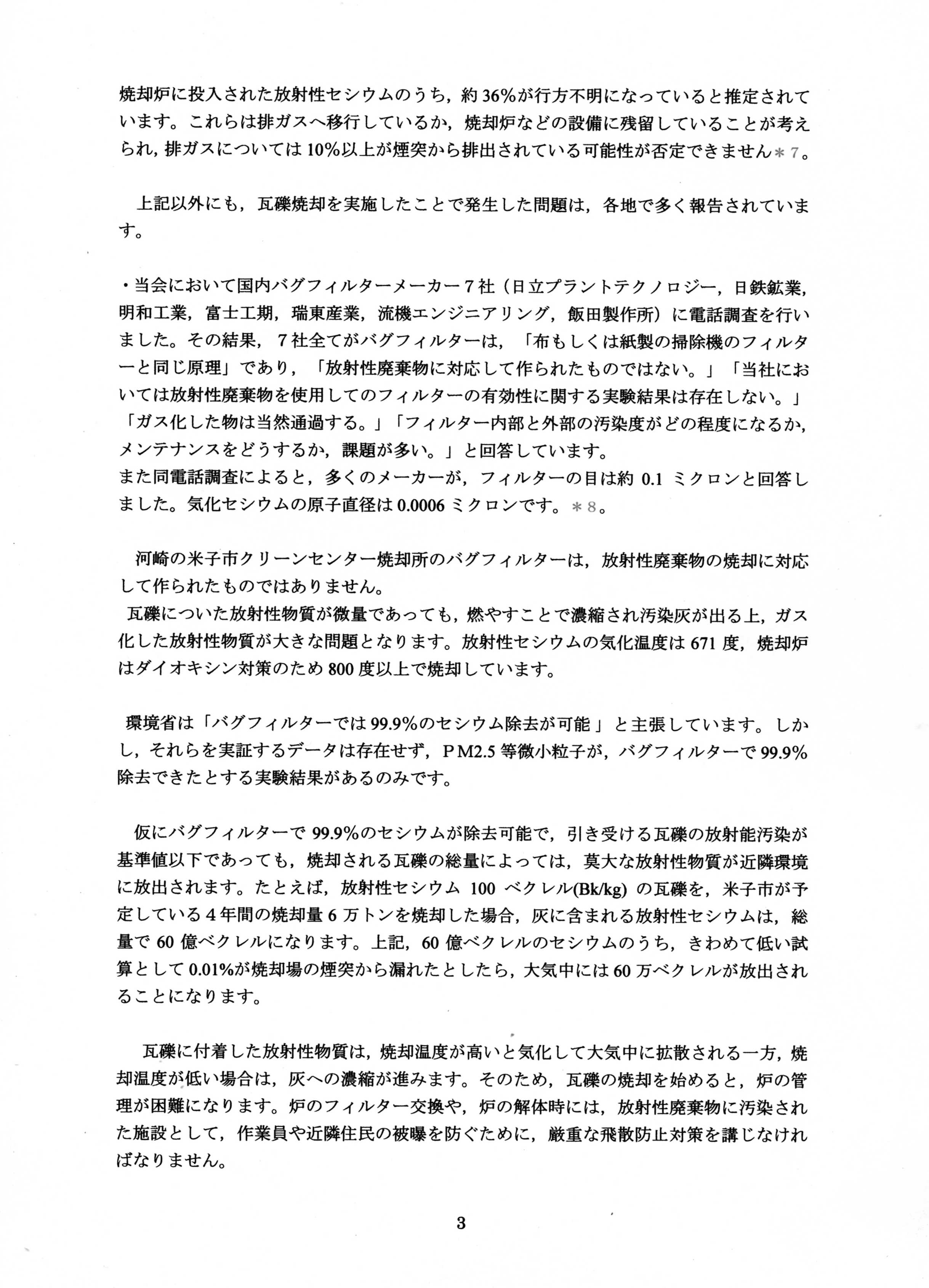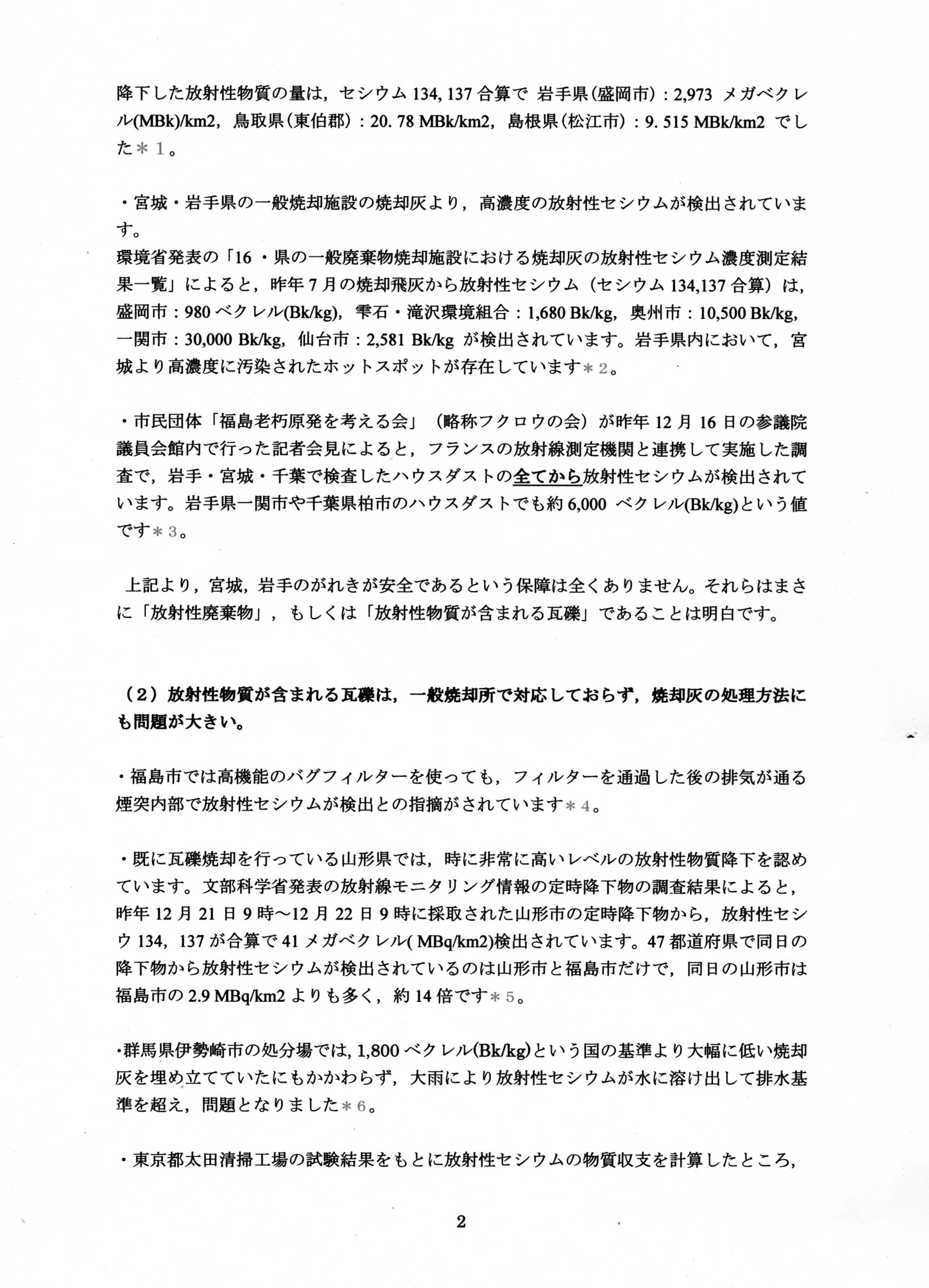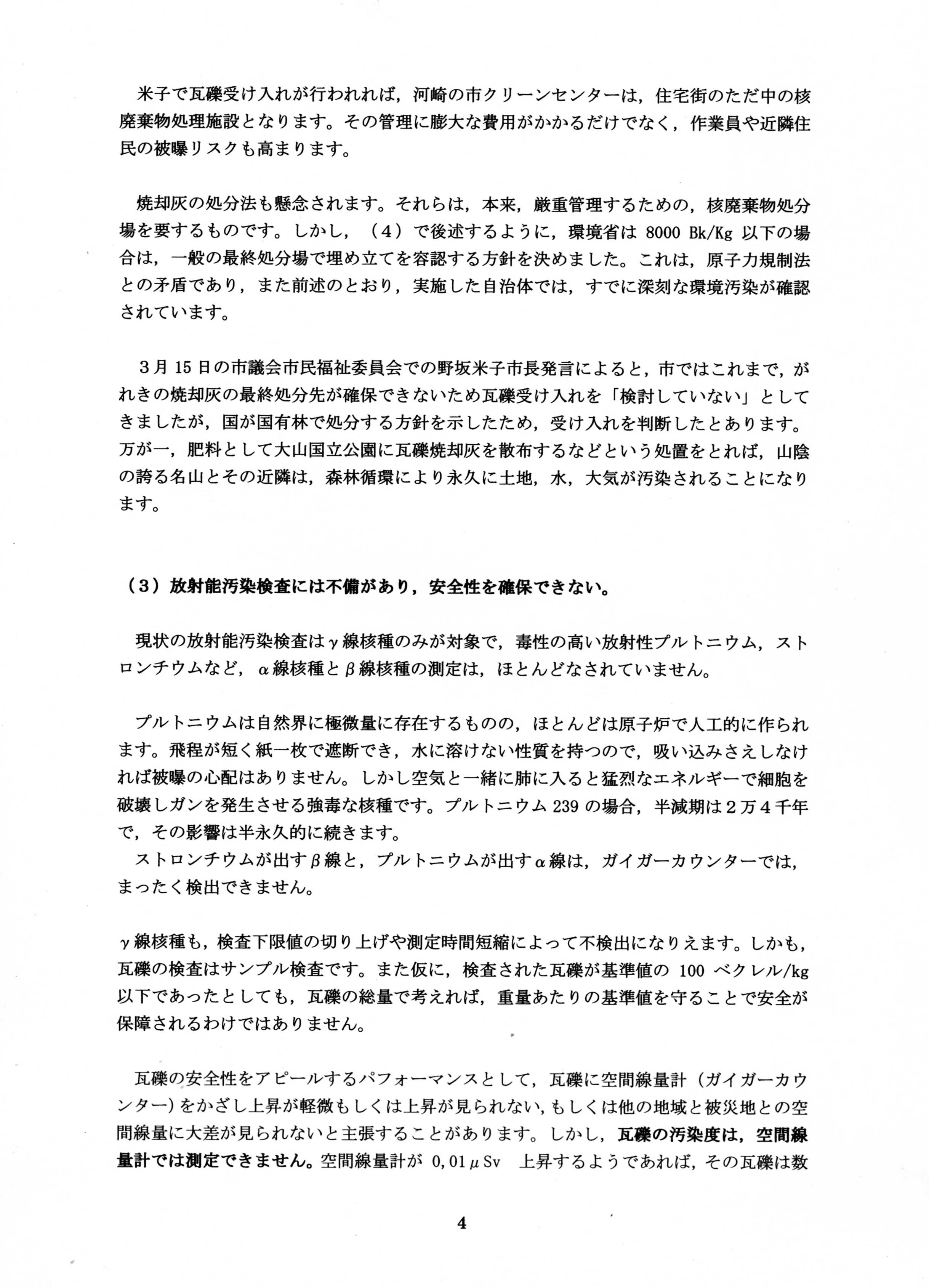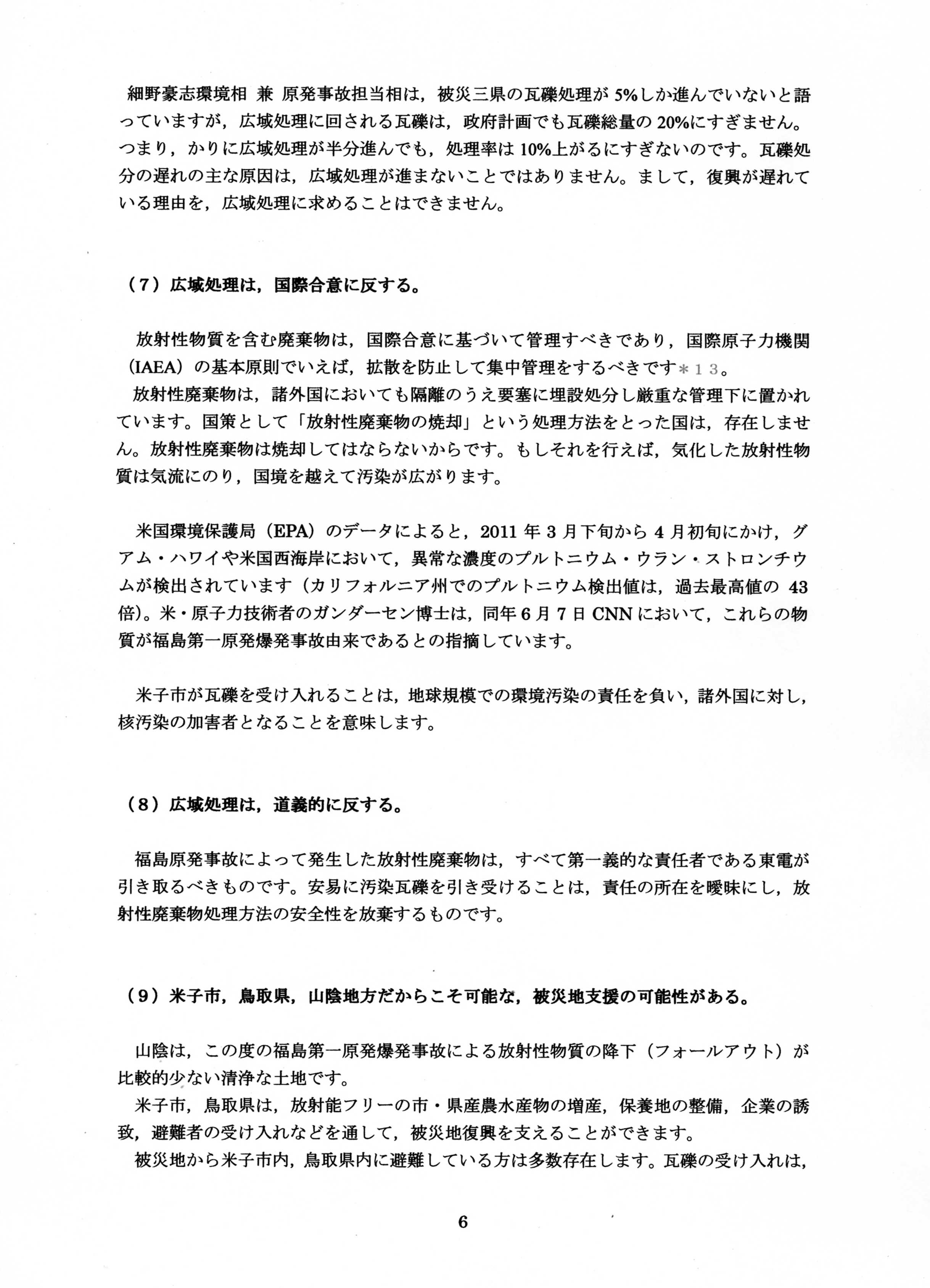 石巻市の災害廃棄物中間処理施設には、1日1500トンを焼却可能な炉があり、米子市が受け入れ表明した、年間1万5千トンを10日間で処理可能であること、宮城県側も、地元の処理能力でがれきを消化出来ると考えていること等を報告し、改めて政府の広域処理呼びかけの矛盾や不合理性を指摘しています。