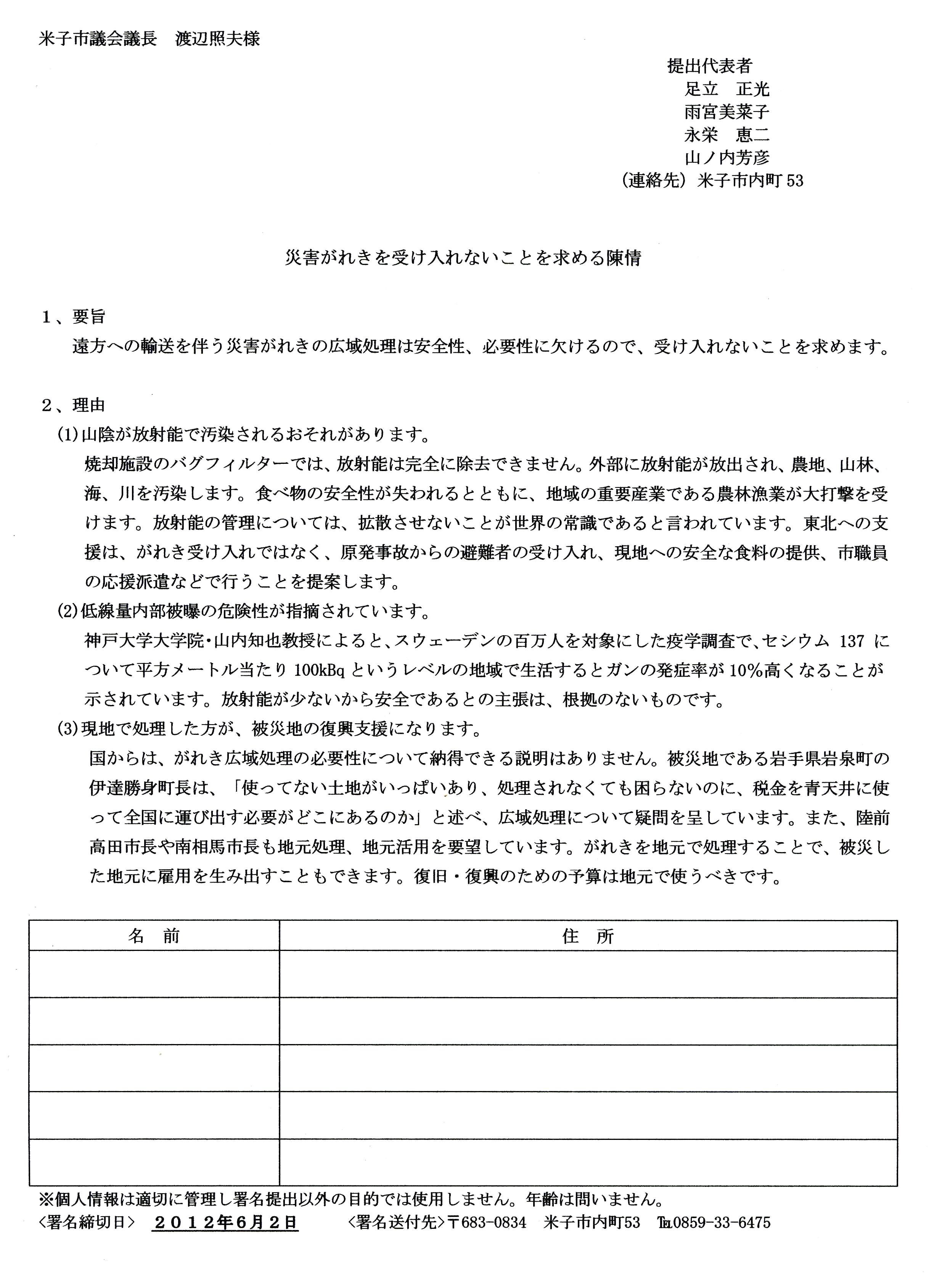 <米子市の災害がれきを受け入れないことを求める陳情>