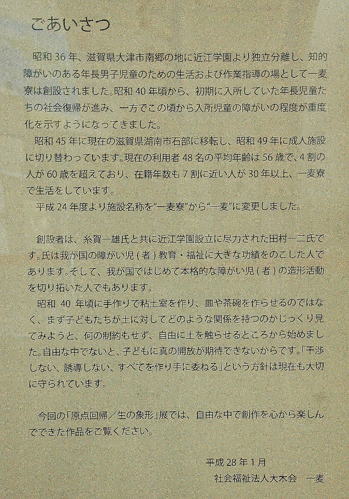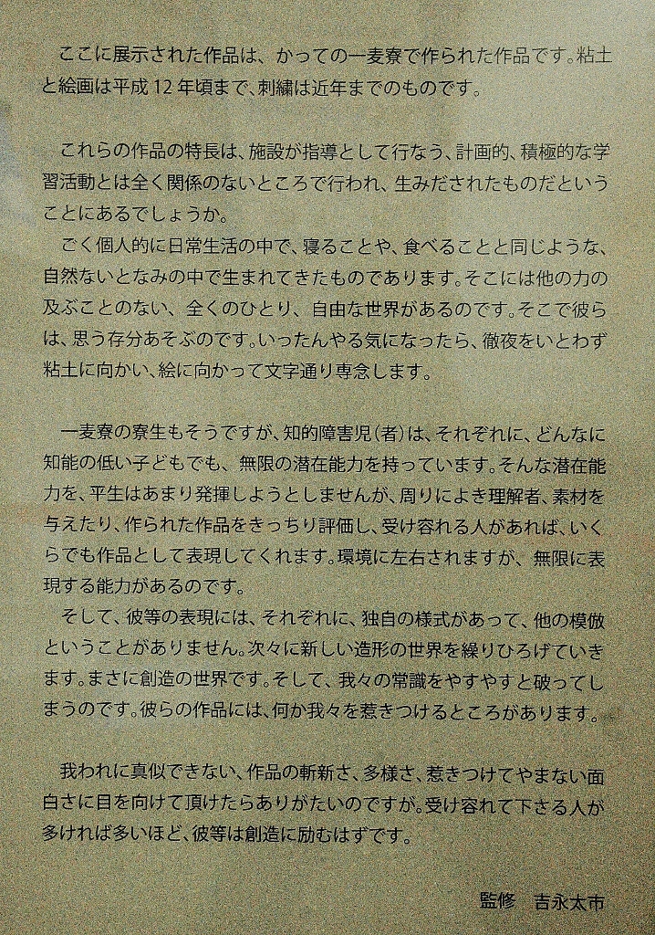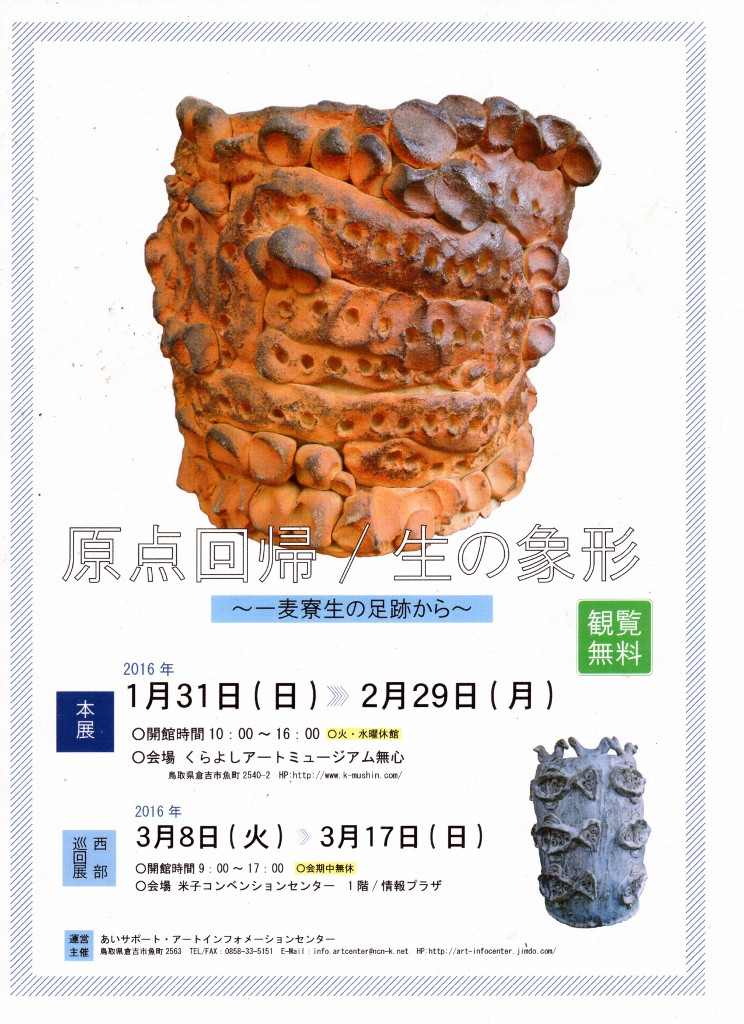 3/8~17< 原点回帰 / 生の象形 >展(米子) コメントを残す 先月の倉吉「無心」での展示に続き、一部作品を入れ替えてコンベンションの広い会場でハイパワーな作品が待ち受ける、 行くしかない! 40年来、障害者と生活を共にし作品の生成に立ち会ってこられた吉永太市翁、展示の指揮をみずから取るために会場入りされた