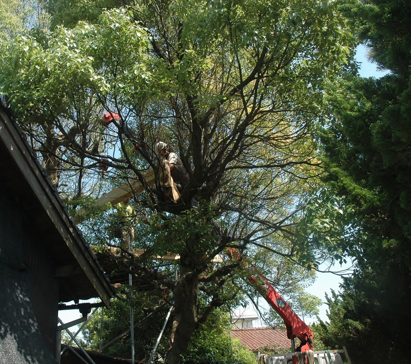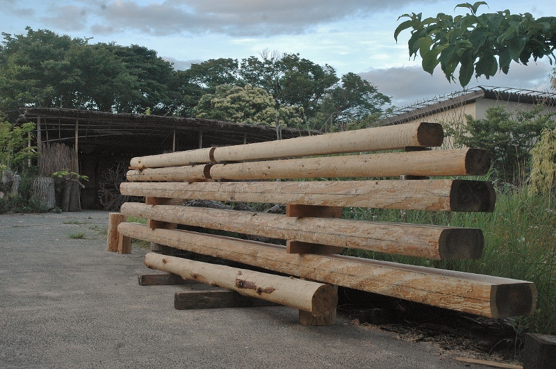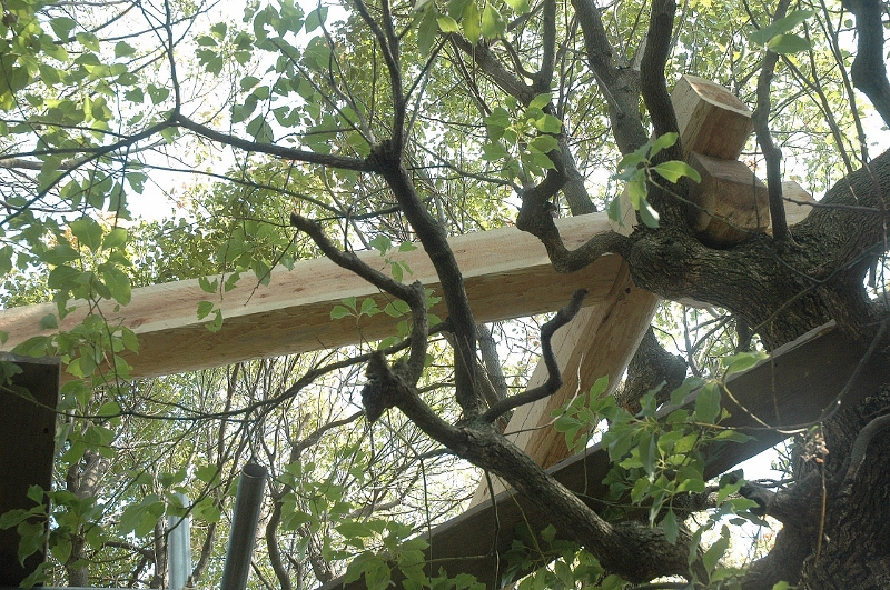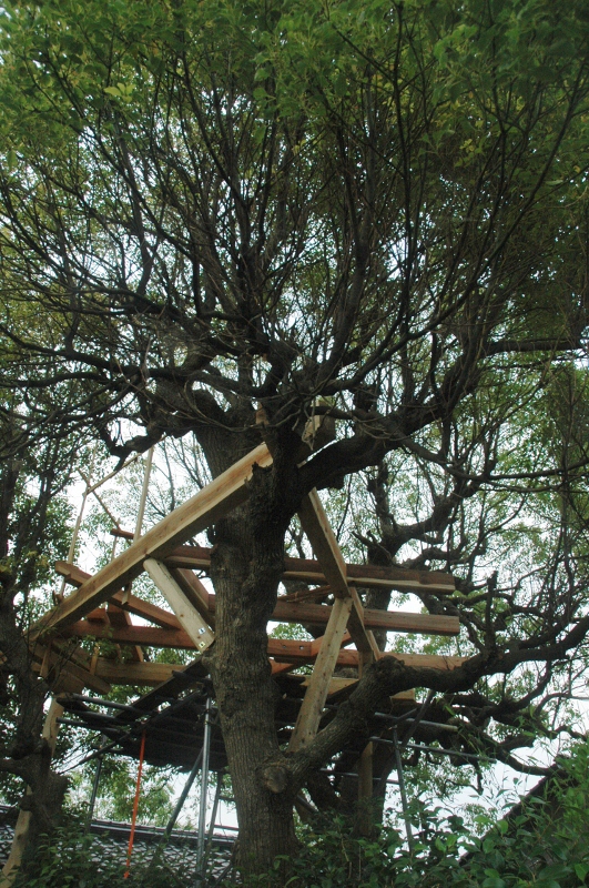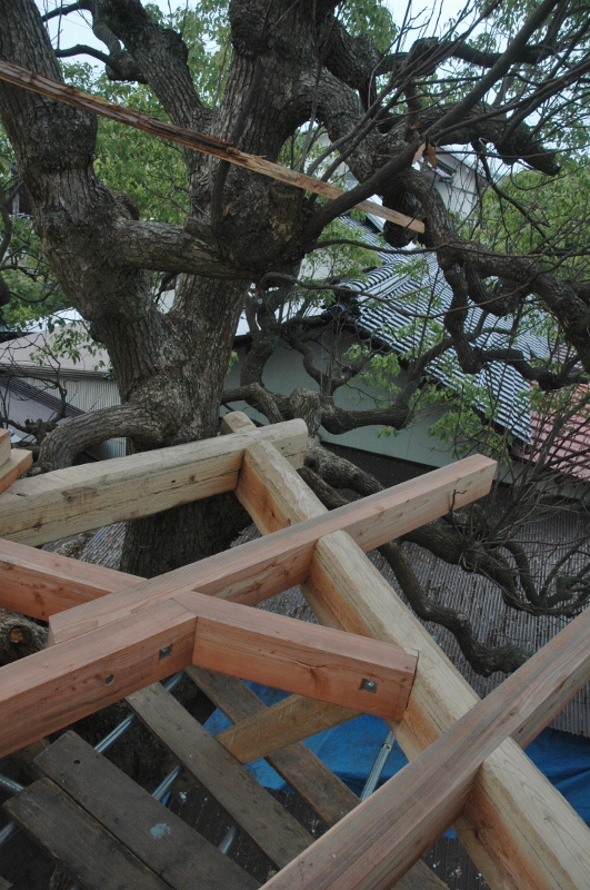 *梅雨空の下、ひと月遅れで始まった現場作業― 3本のクスノキに3本の桁を渡し、頬杖で支える。 そしてデッキの下地になる桁を組み入れる。