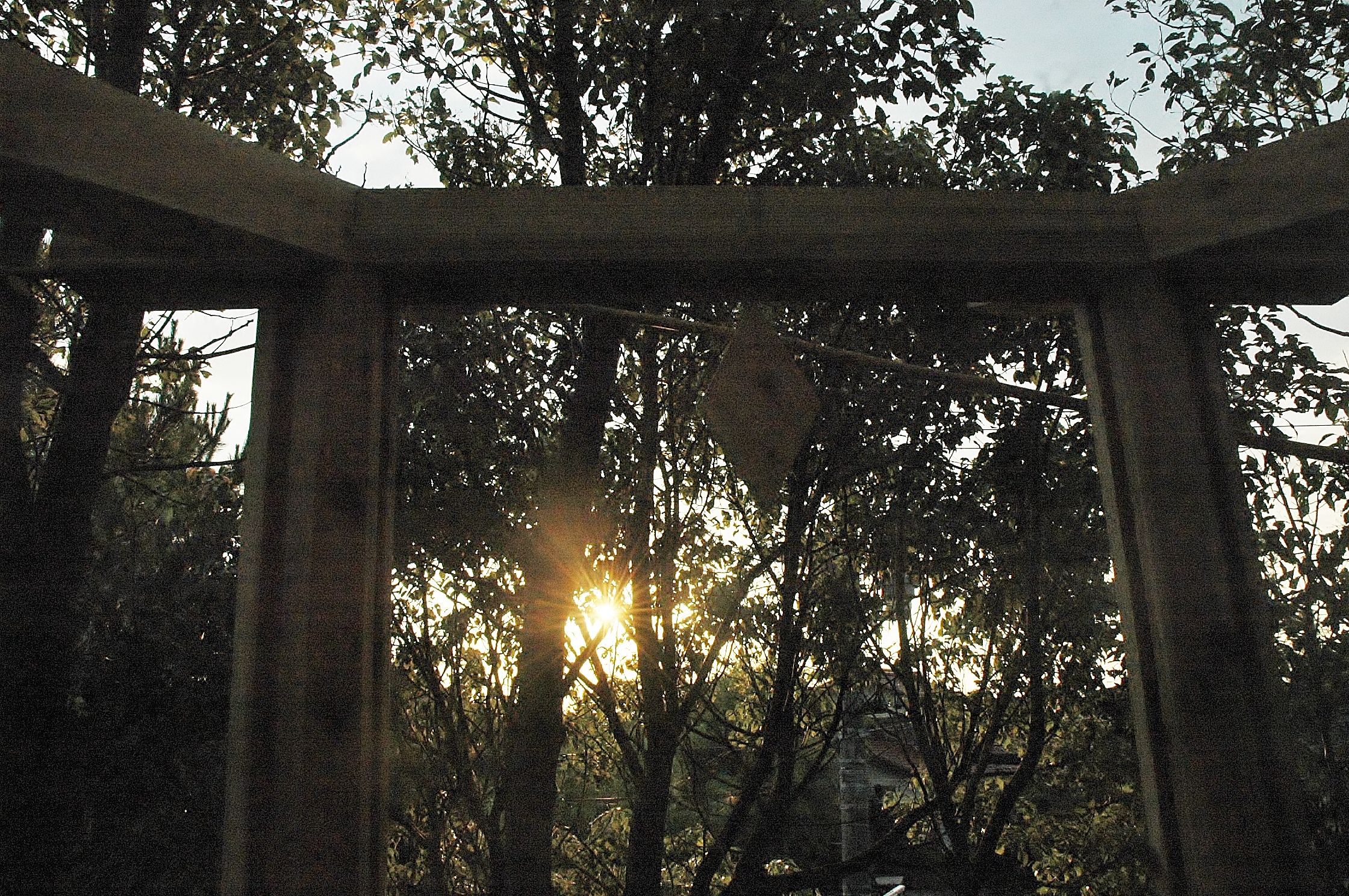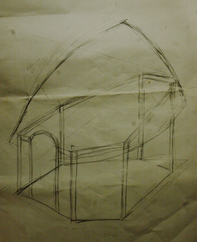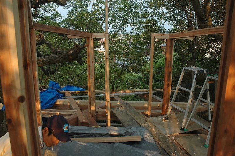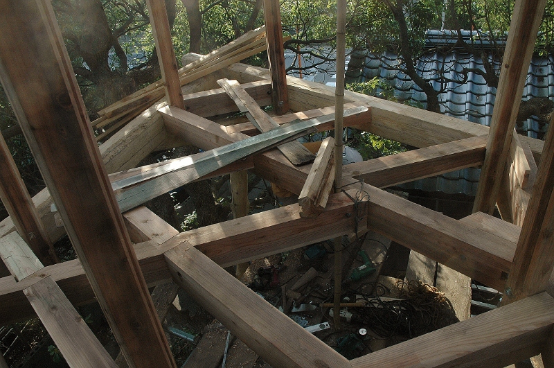 *デッキが組み上がり、六角形の小屋を立ち上げる.