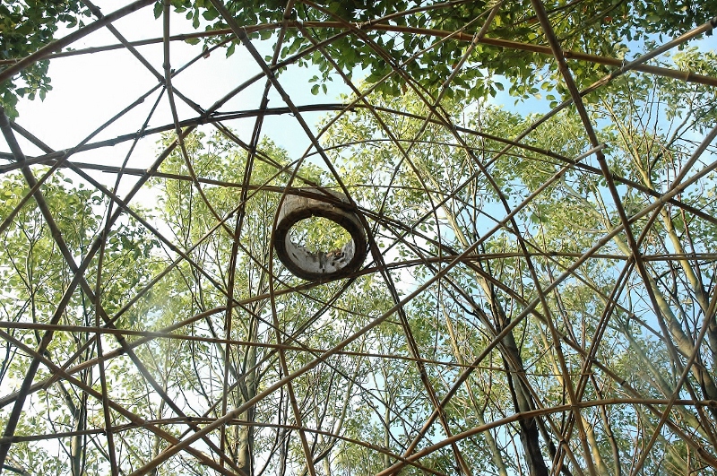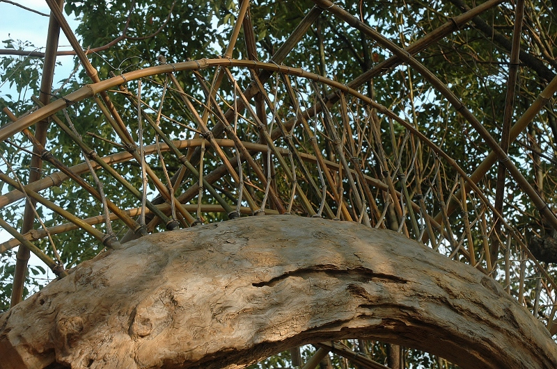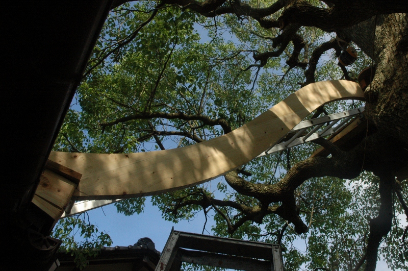 *昇る階段の設置、小屋の屋根の竹組、天窓取り付け そして入口上の竹枝ファサード