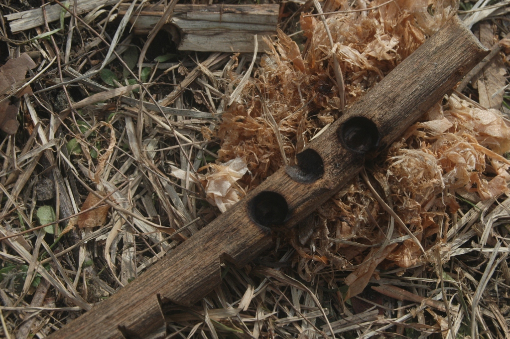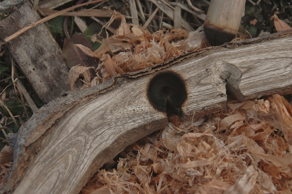 そして受けになる木は始めヒノキの板を使って火が点いたけれど、厚みがなくすぐすり減るので、工房内の枝を物色していろいろ試す。