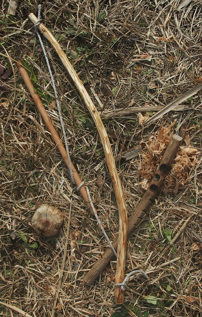 弓(アスナロの枝)は丸棒がスムースに回るようなテンションで張り、上の押さえは抵抗が少なくなるよう、穴は小さめに。オイルを使ってもいい。