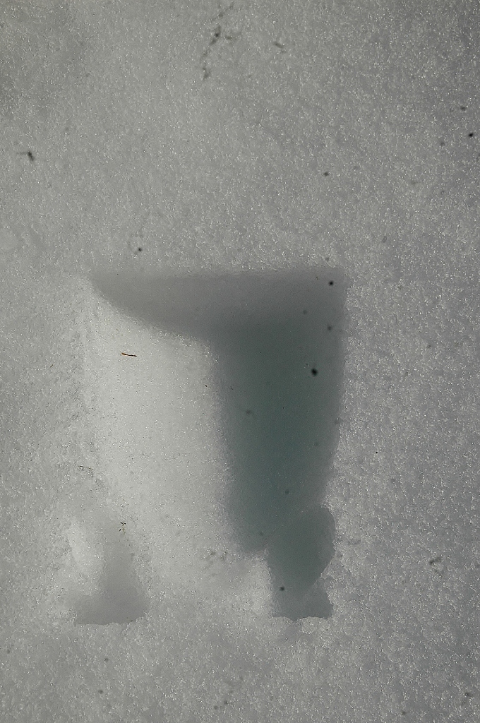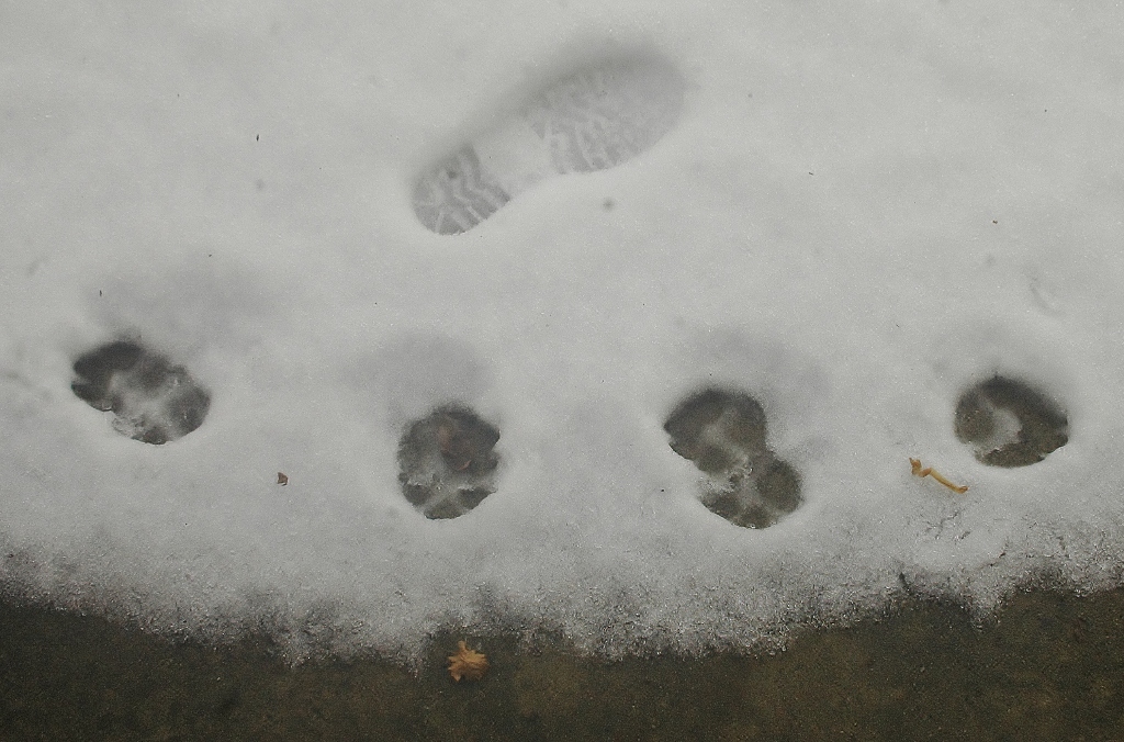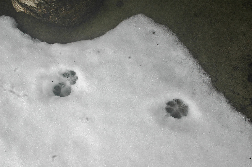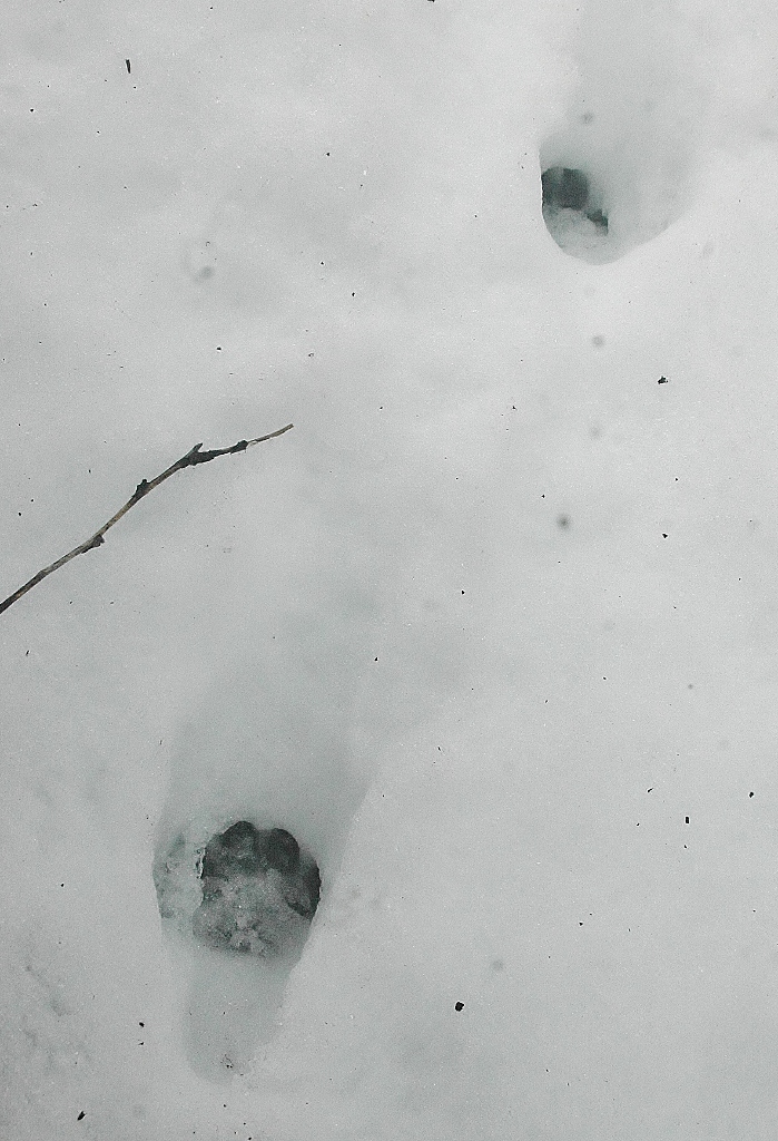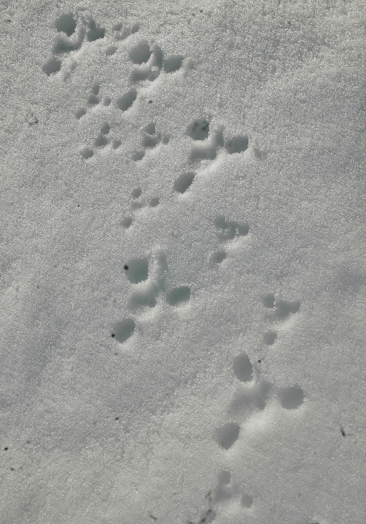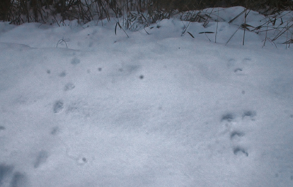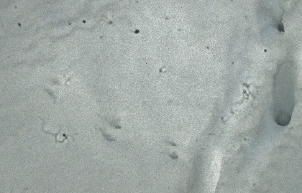 *雪解けが進んだ工房内に動物たちがやって来てそこかしこに足跡を残している.(その中に見かけぬ三本脚の足跡が・・・?!)