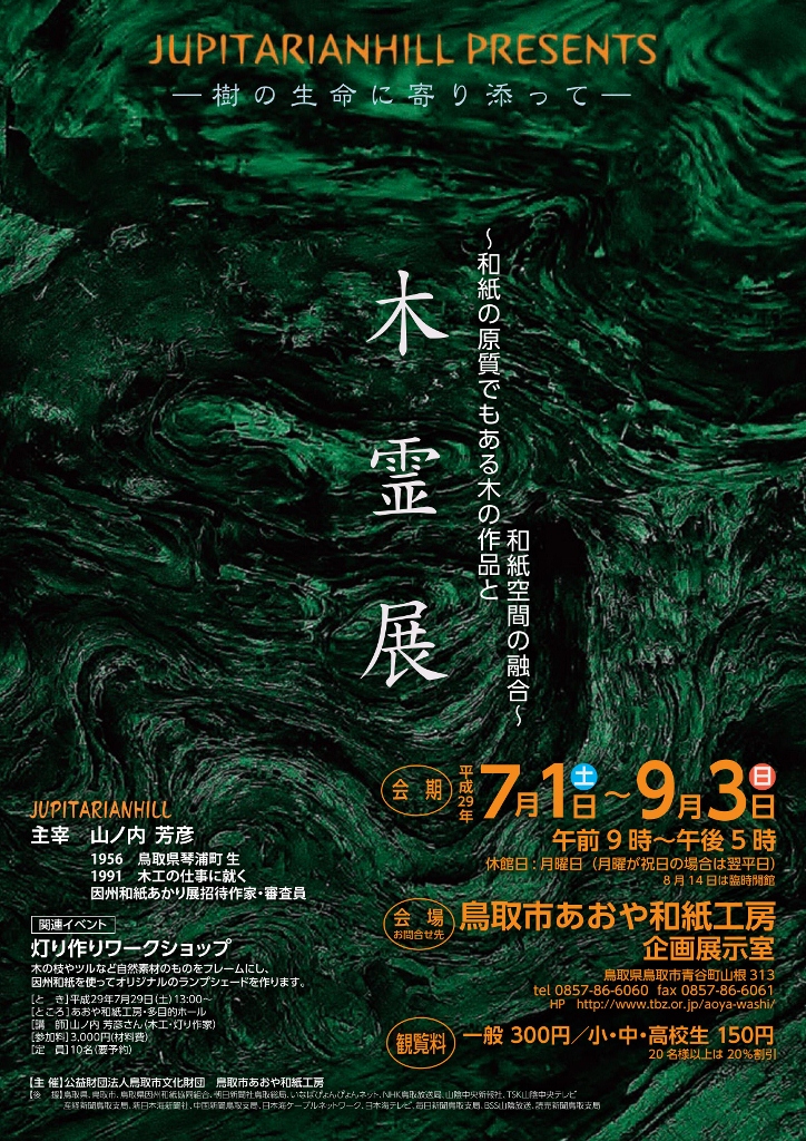 7/1~9/3 ・・・『 木 霊 展 』 ・・・ あおや和紙工房 コメントを残す **2009年の「innerforest」以来8年を経て、この夏鳥取あおや和紙工房にて個展を予定しています. 三十過ぎに帰郷し樹の枝に魅かれた出会いから、樹という生き物が見せる命の形を活かす作品作りを始めて四半世紀、会場に造り込む和紙空間に、近年の作品を持ち込んで、命を吹き込みます.