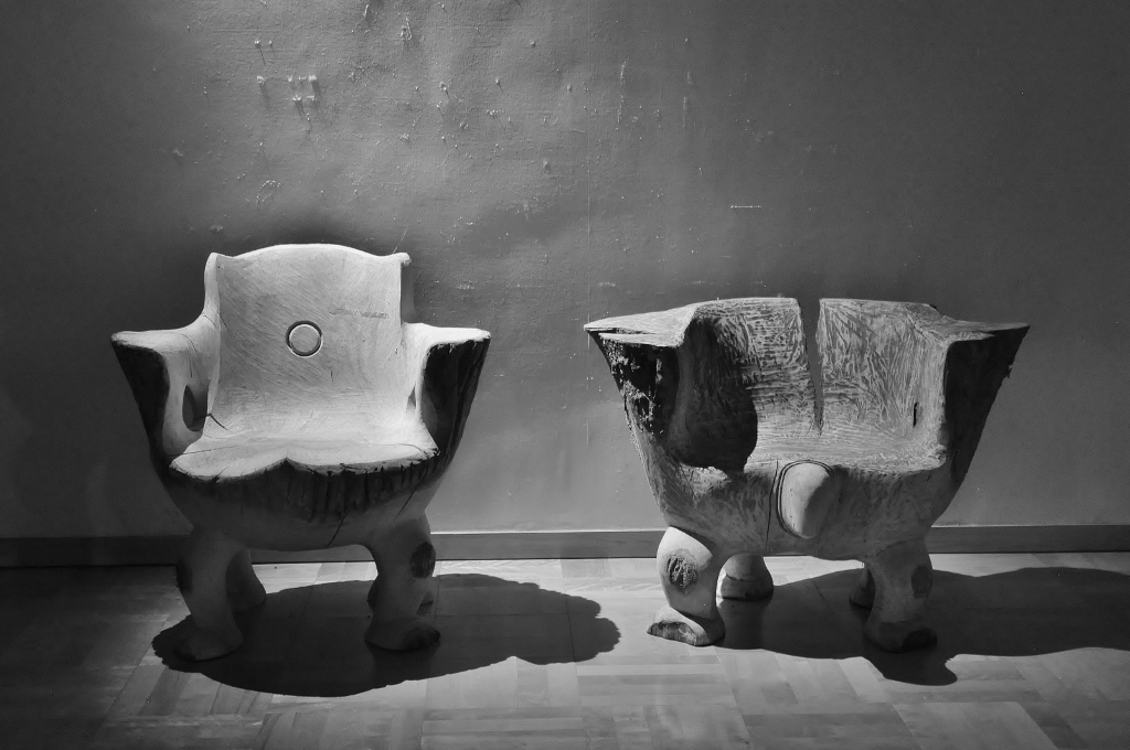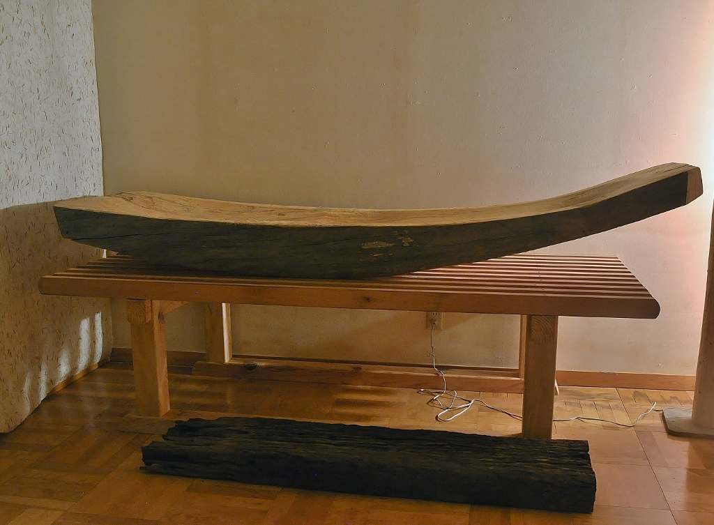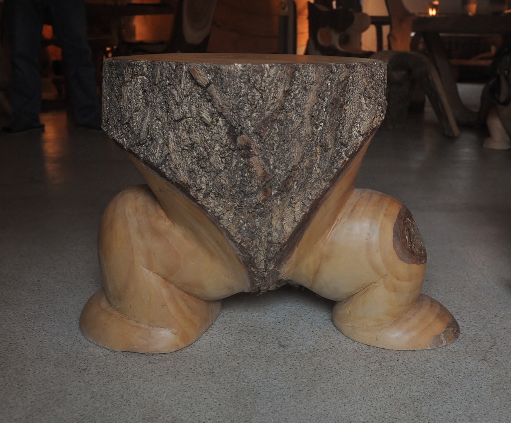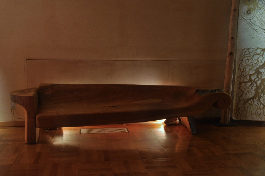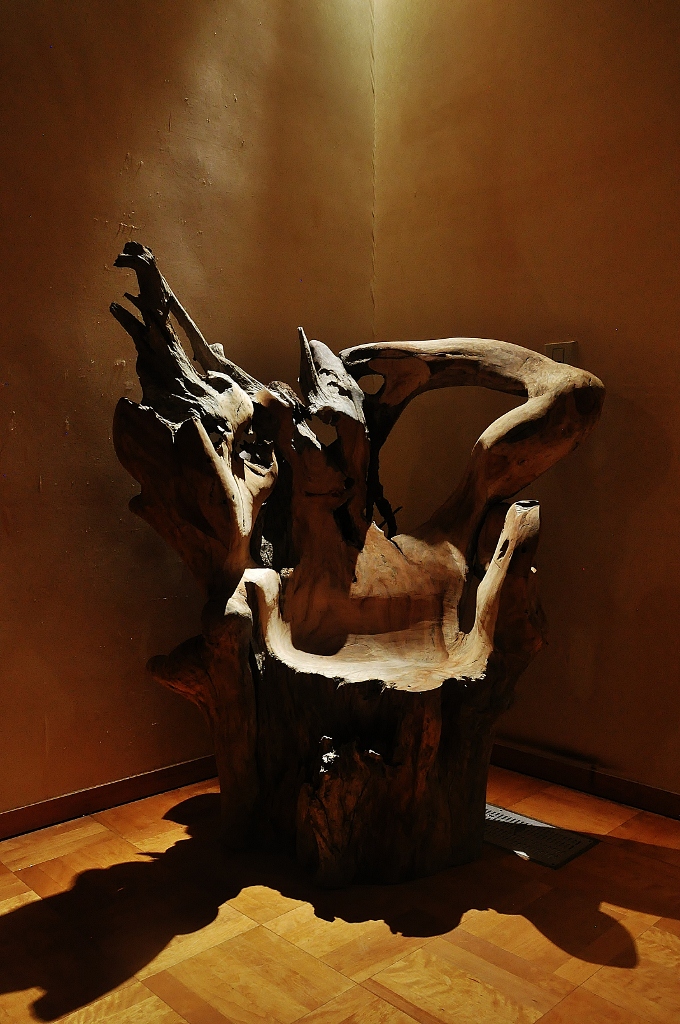 手掛ける木は主に樹齢100年を超えるような大木で「形は木を触りながら、目の前の木と対話するようにしながら決まる」という。その手にかかれば、南部町の神社にあった推定樹齢600年のシイの木は重厚な椅子に、曲がった松は寝心地のよいベッドになるなど、家具や木工作品に様変わりする。