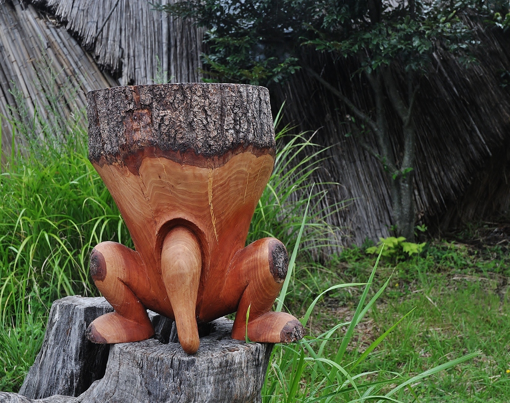 山ノ内さんは30年前に東京都からUターンし、木工作家に転身。「生きている木は大事にされるけど、枯れてしまった木は相手にされない」。チェーンソーやカンナを用い、不要になった庭木や工事で伐採された木、形がいびつで買い手がつかない木を生かそうと制作に励んでいる。