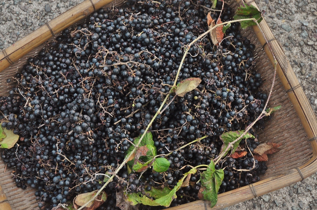 【 野食 】四種・・・・ コメントを残す *ギャラリーの竹壁に鈴生りになったアケビ、大粒の栗とその根元に群生する木の子(クサウラベニタケ?)、 そしてJH入口のアーチに、十年前栽培種のヤマブドウから植え替えたエビヅル(蝦蔓)がカーテン状にたわわに実を付ける。酸味が強いので果実酒に、疲労回復、造血作用がある.