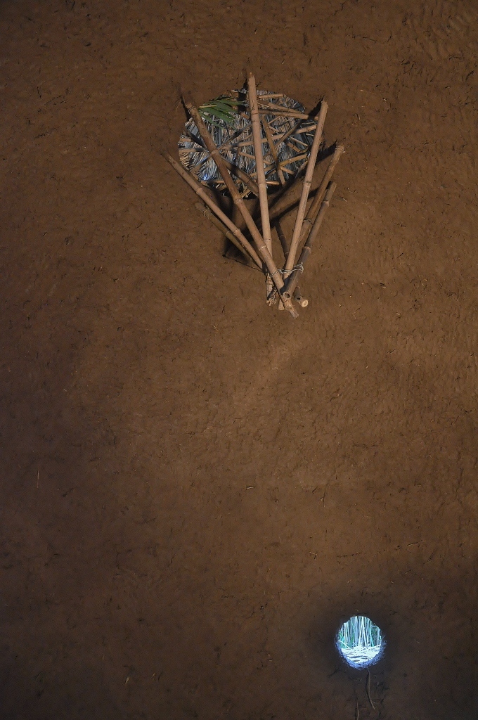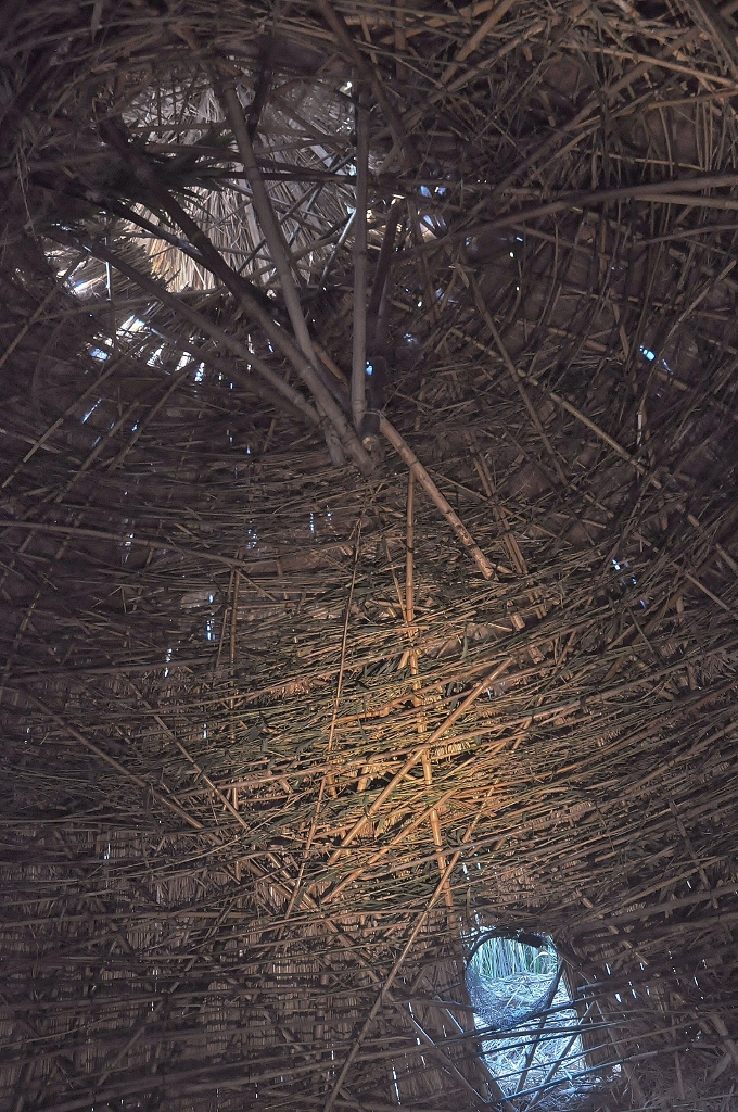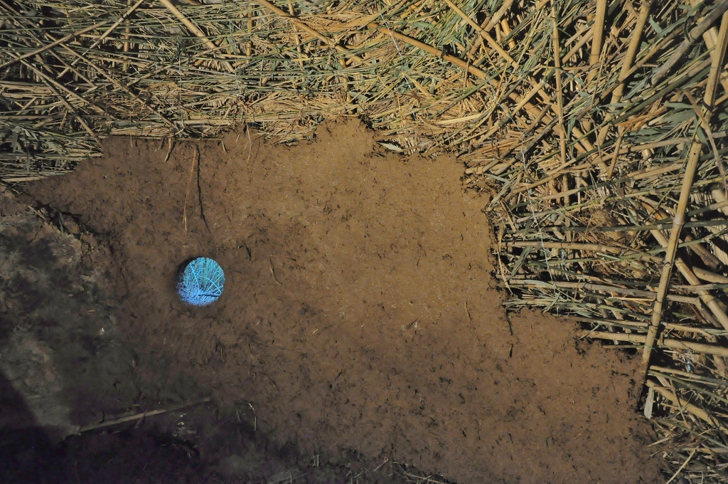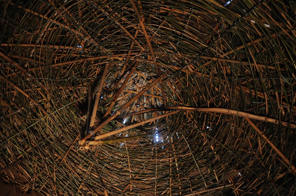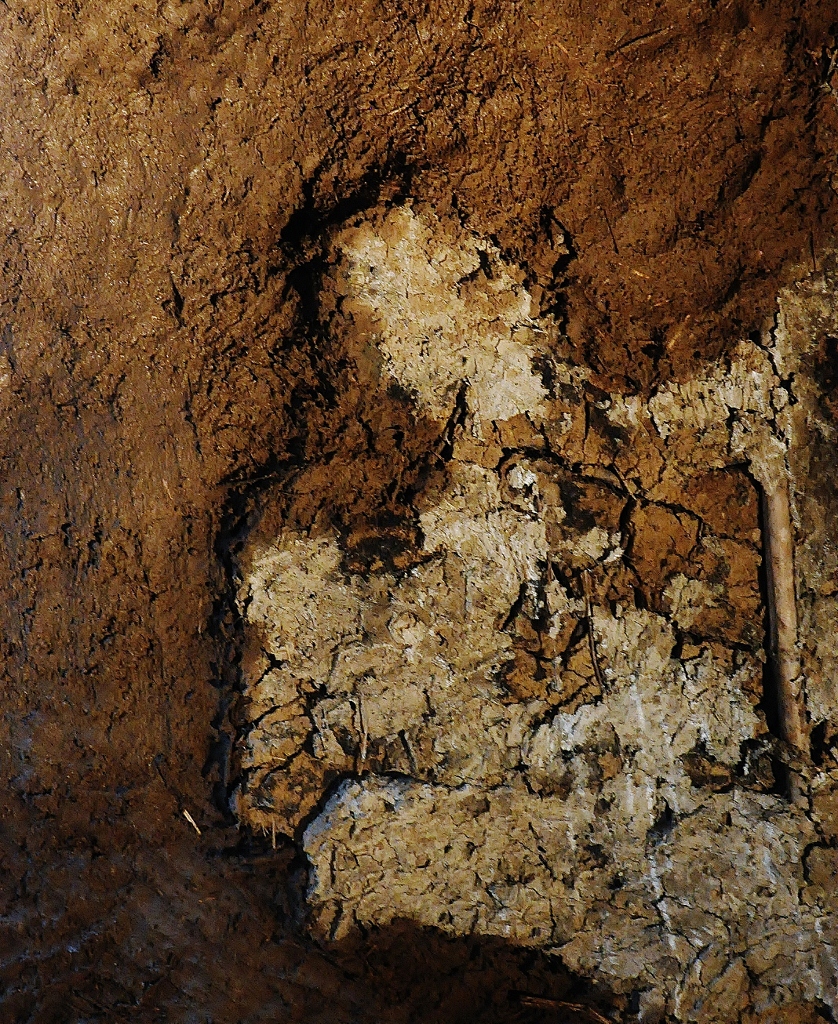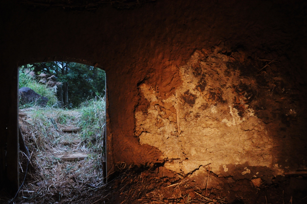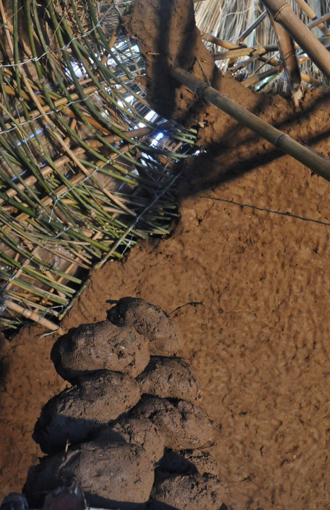 < ドローム rebuild >Ⅲ・・・・ コメントを残す *葺きあげたカヤの穂先をカットして仕上げ、内部土塗りのための下地を笹竹で作る。 そして崩れ落ちた壁土を再度練り直し、塗りつけていく. ー崩れ残った前の壁に憂いを帯びた白い牛が現われるー 関連