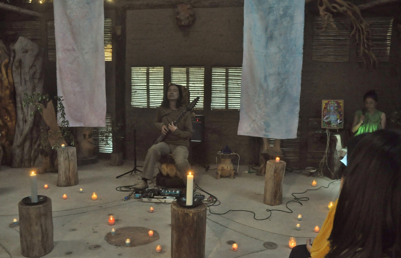 「チャップマンスティック」という楽器を奏するwoody moja氏の演奏と詩が朗読されてゆく.