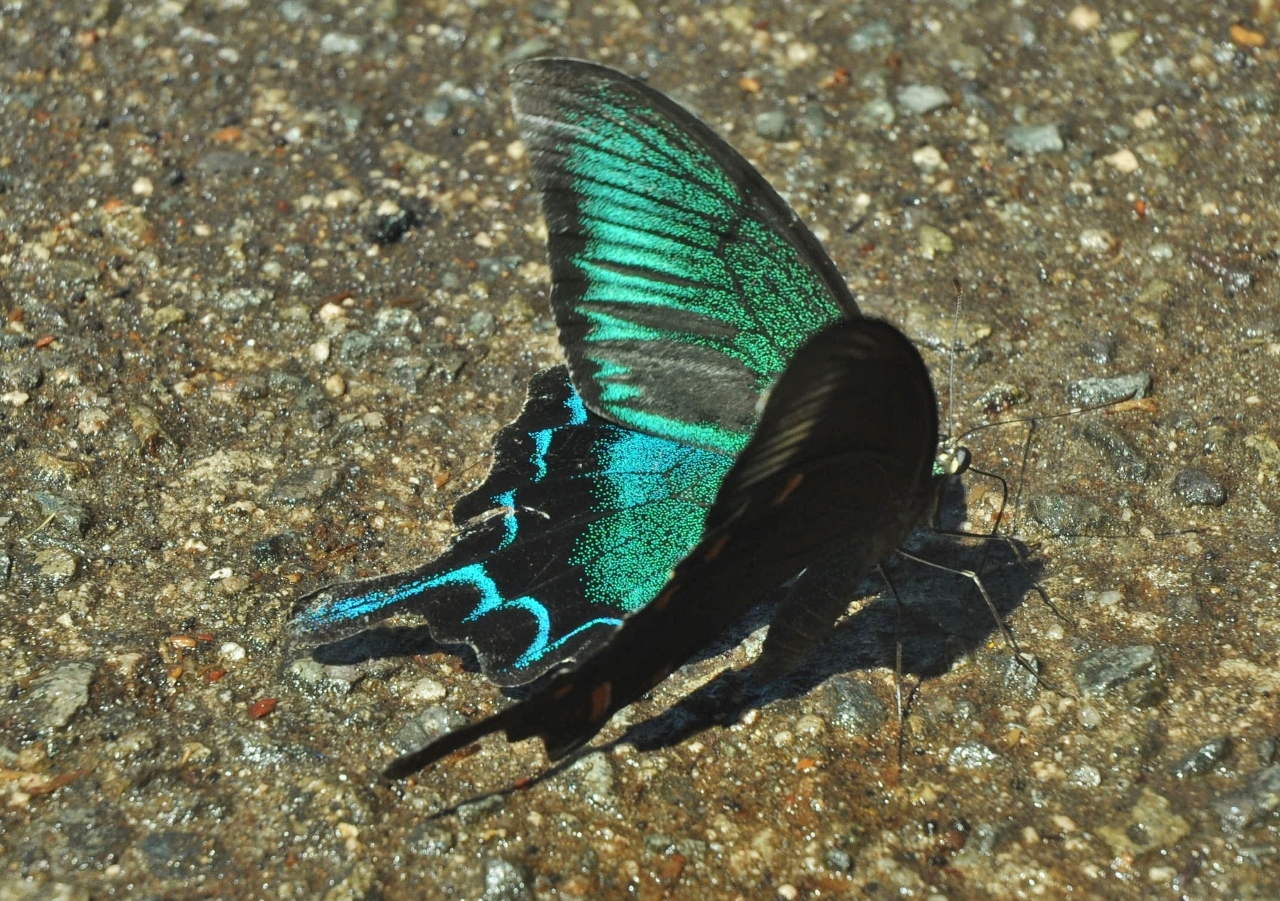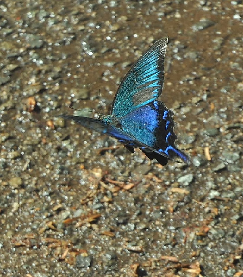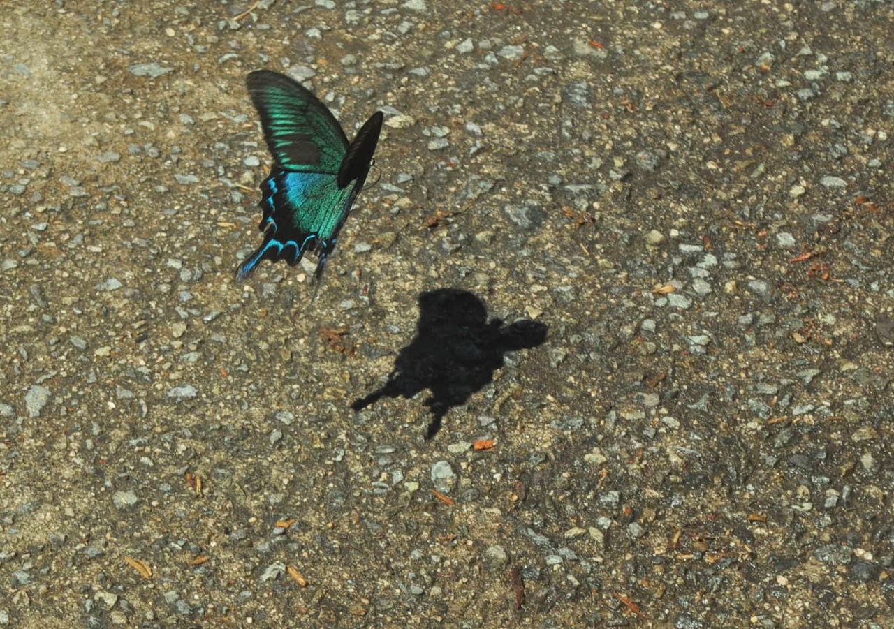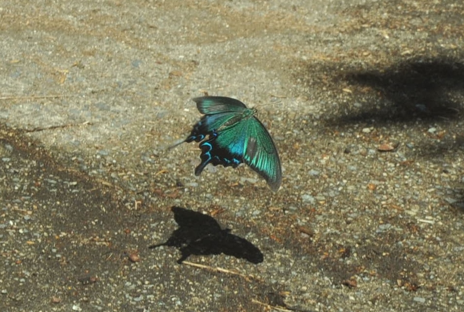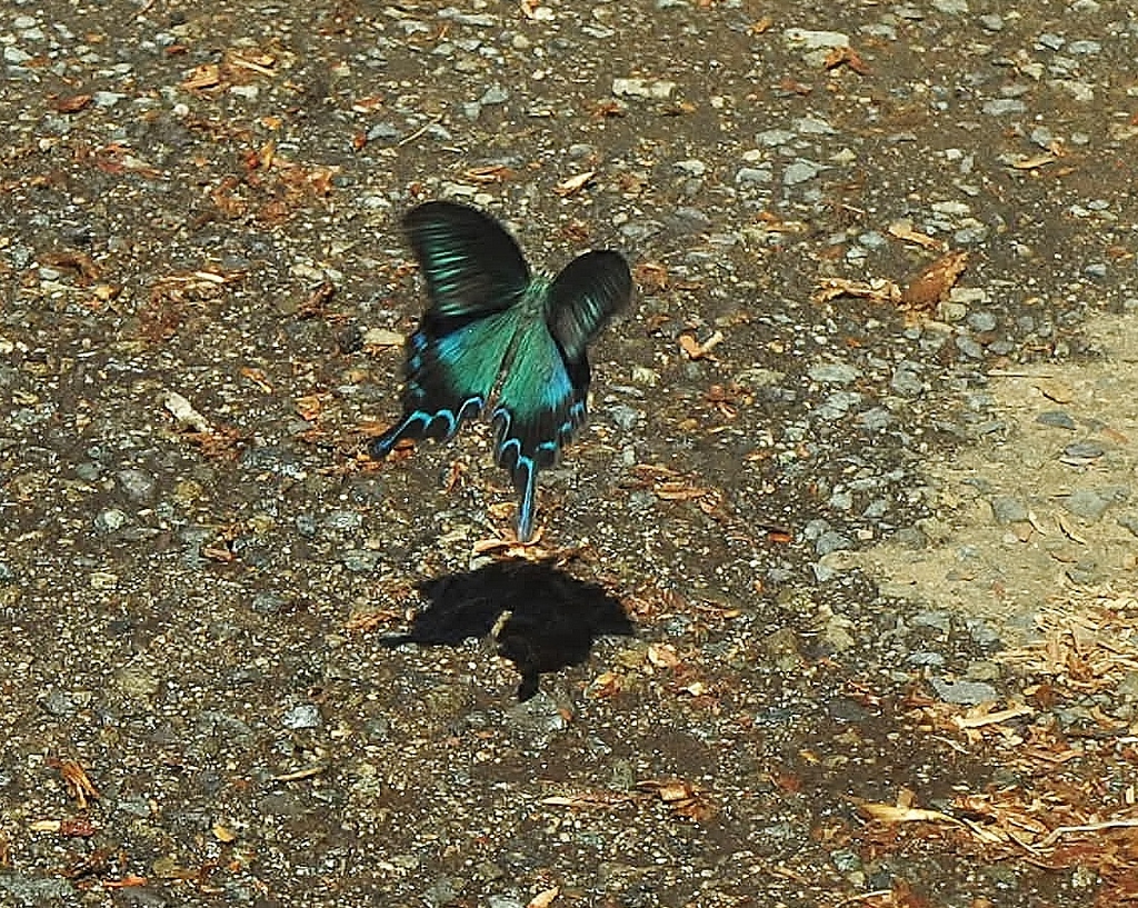 *地面に撒いた風呂の水にカラスアゲハが舞う。その羽を広げた時に見せる色彩に目を奪われ、しばしカメラで追い回す。(7/95枚)