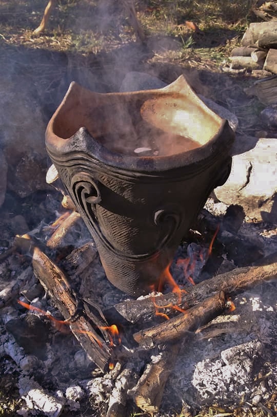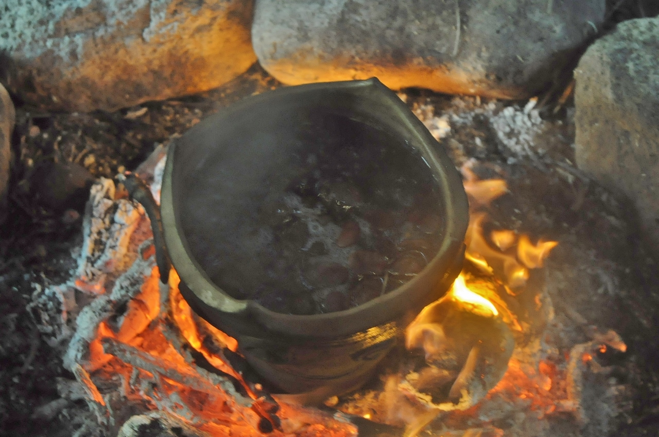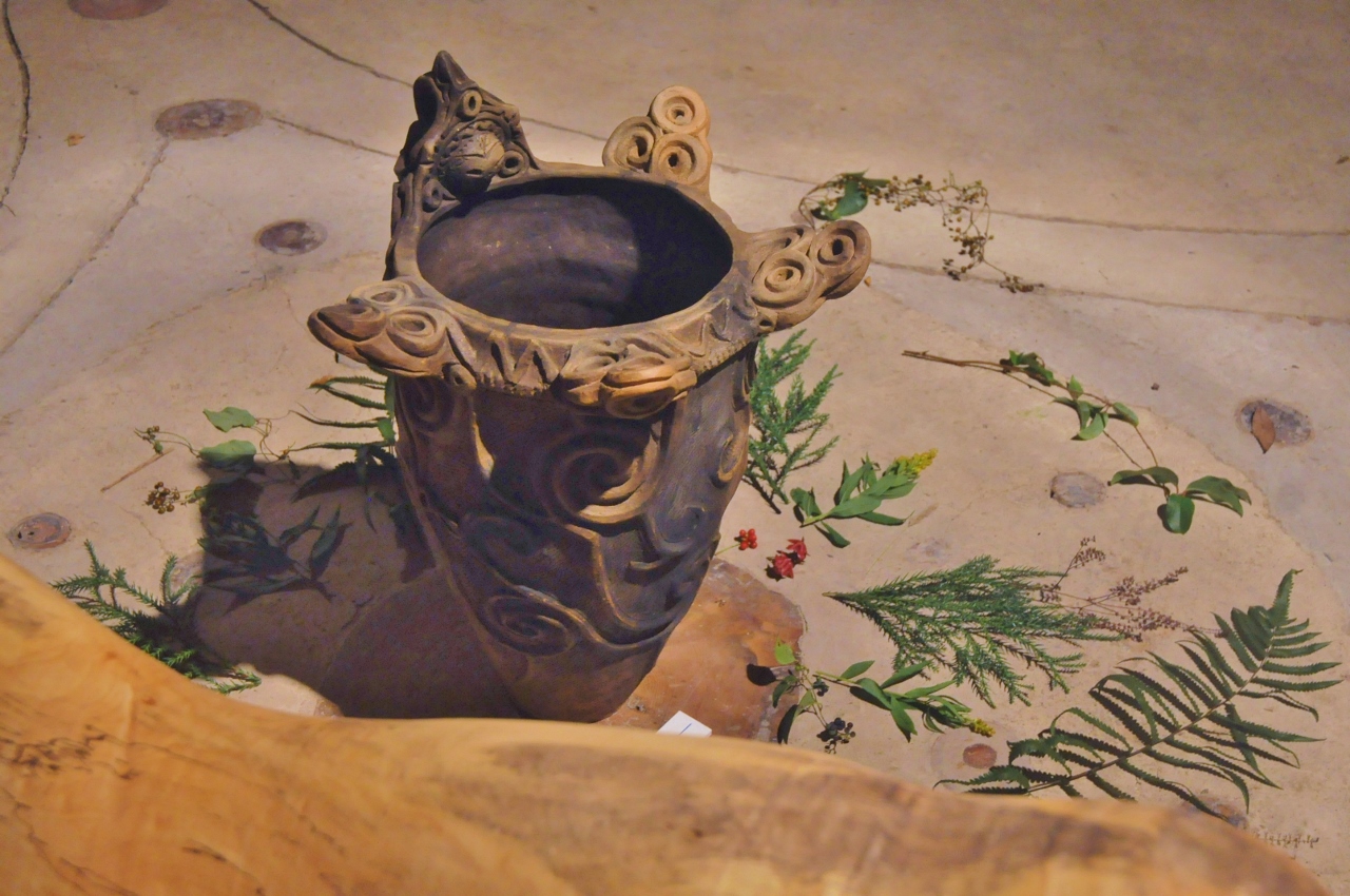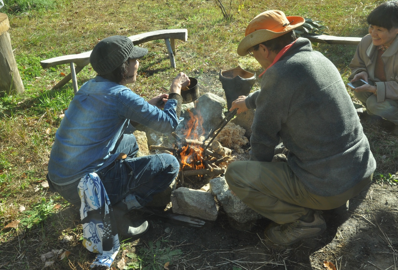 *新見の縄文土器作家「猪風来」(いふうらい)氏の元で作り続けてきた小野真由美さんの作品展と、縄文土器でシシ肉と野草茶の煮炊き。