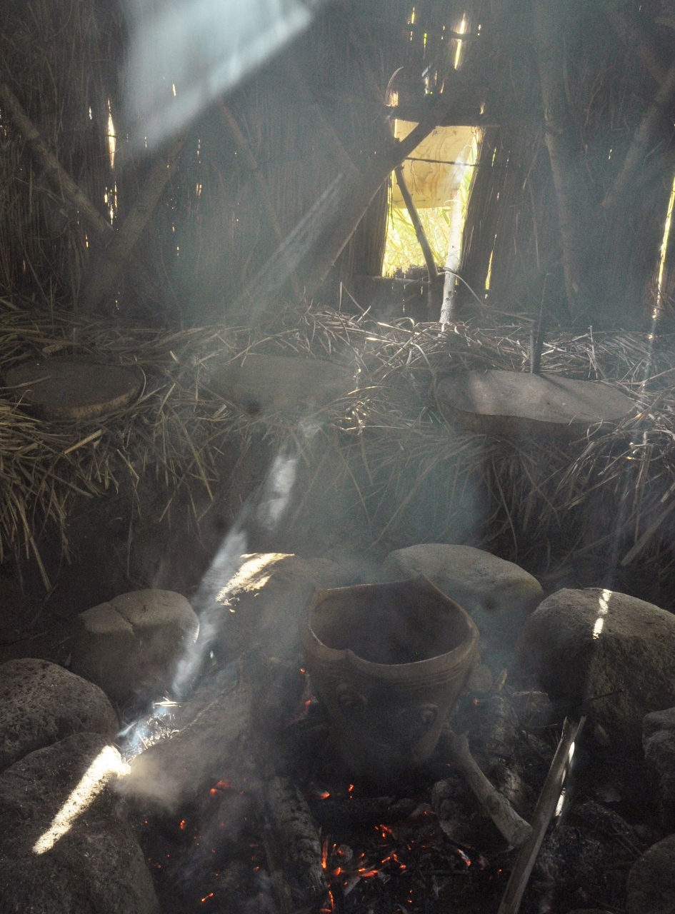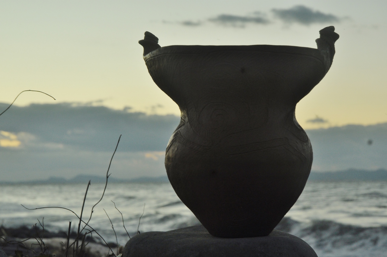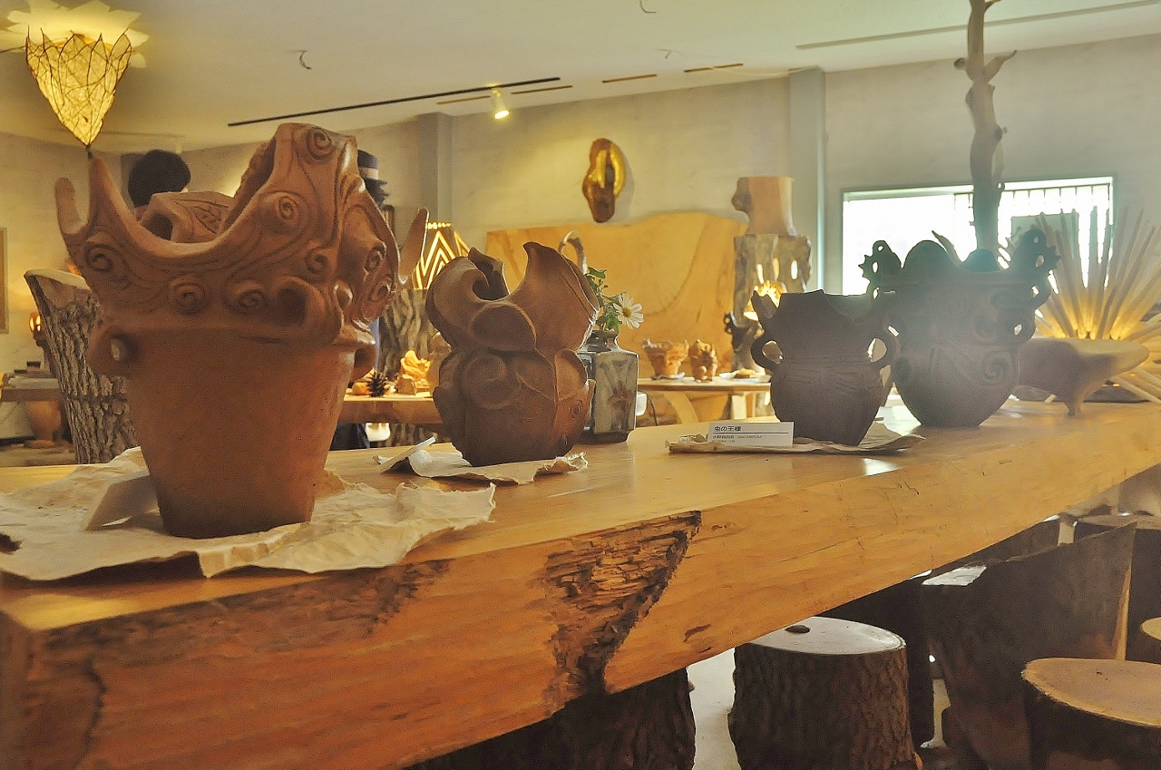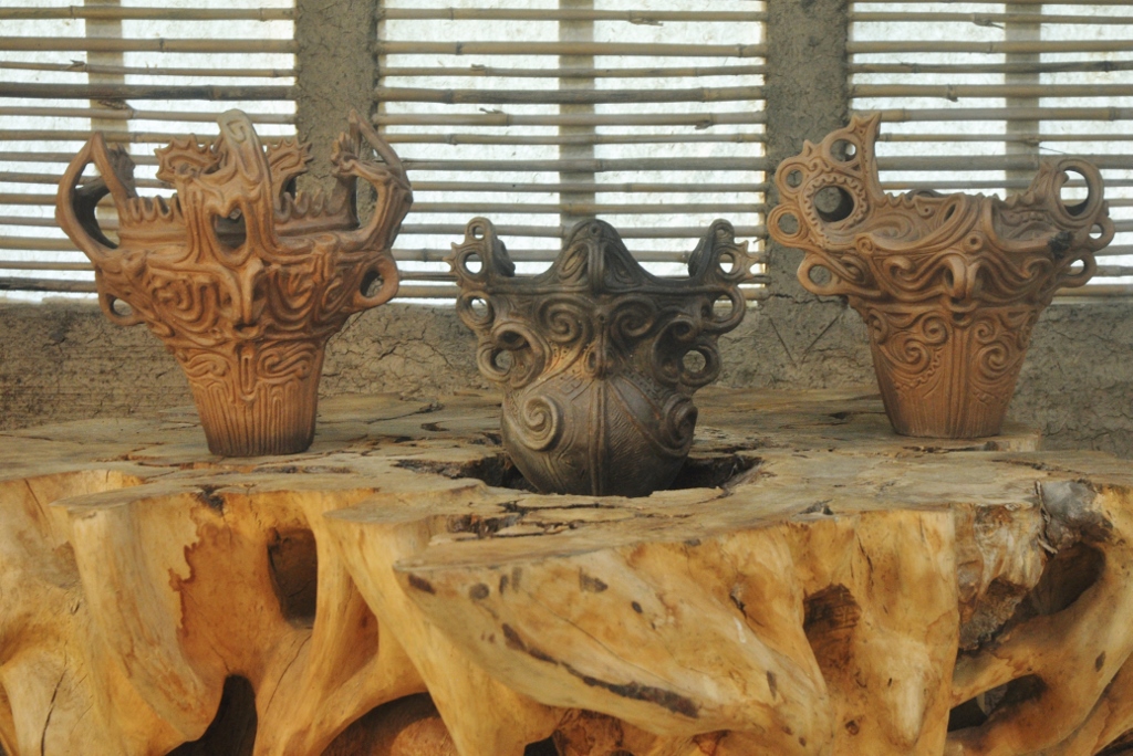 *新見の縄文土器作家「猪風来」(いふうらい)氏の元で作り続けてきた小野真由美さんの作品展と、縄文土器でシシ肉と野草茶の煮炊き。