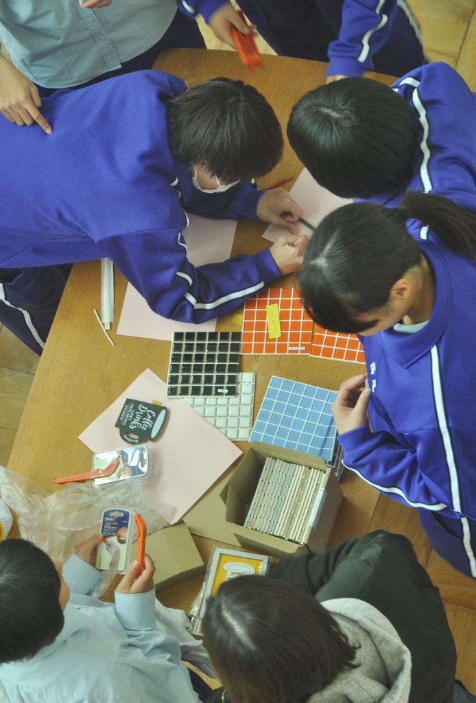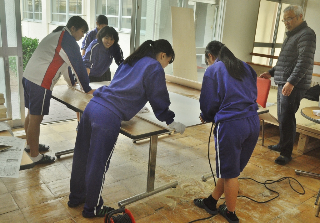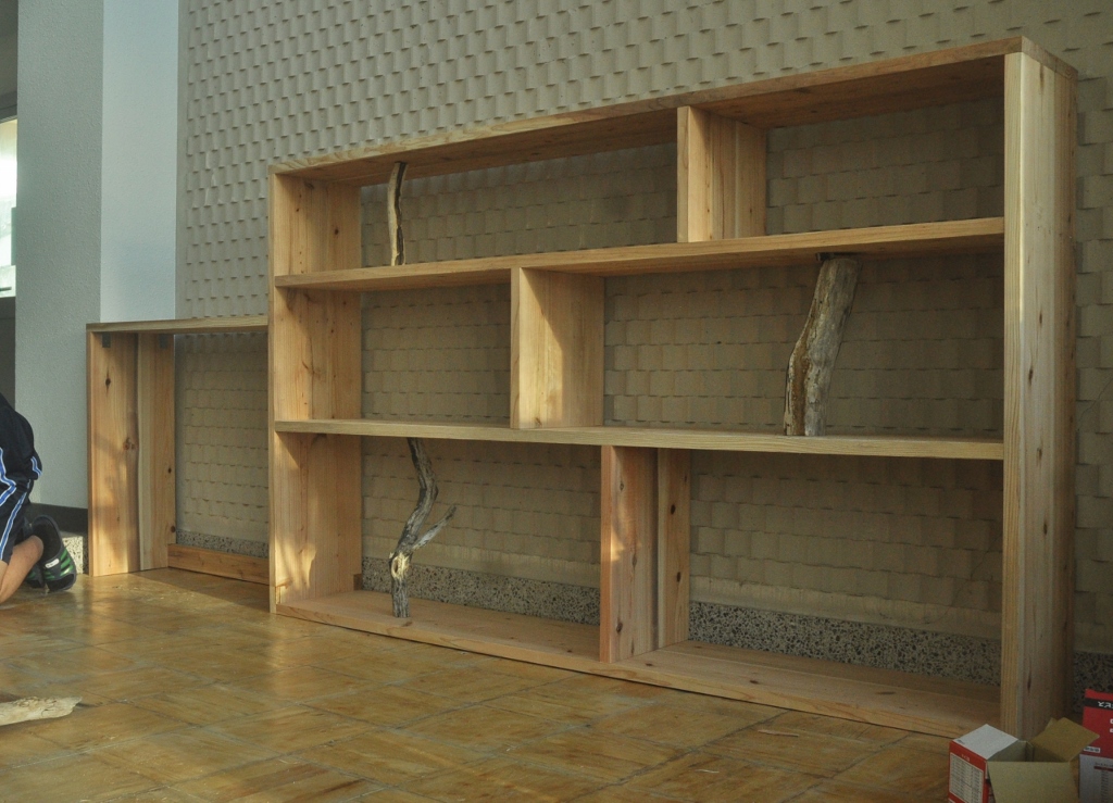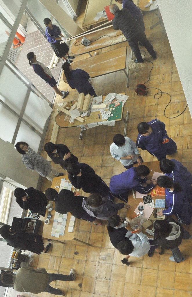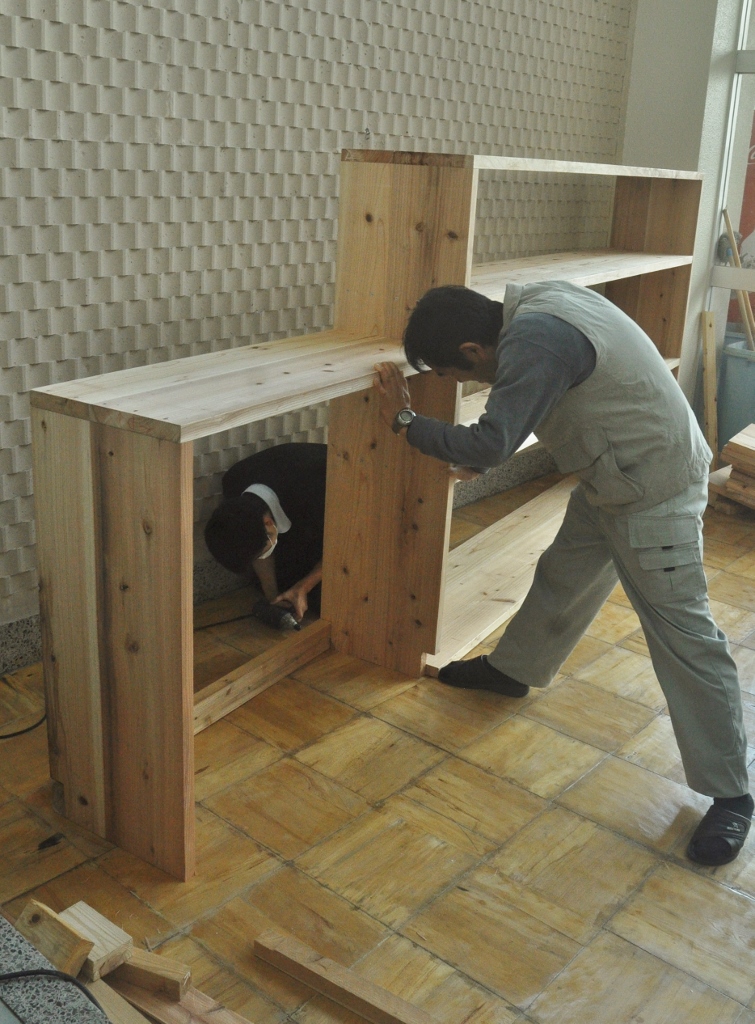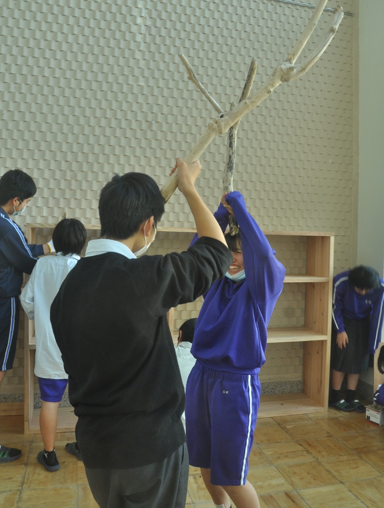< Highschool cafe project >again コメントを残す *この夏中断していた校内コモンホールのリノベーションが再開。 集まった20人位の生徒が3つのセクションに分かれ、男子4名とあらかじめ用意した部材で本棚を組み立て、壁側に設置する。 春に近くの海岸から集めていた流木をしきい代わりに立てる時は皆がワッと寄って来て盛り上がり、手に取って遊び出す。これで一気にオシャレな棚に変身する。 他に既存のテーブルにカラフルなタイル張りでデコレート、そして売店のゴミ箱のカバーを制作(未完). 皆の手で作られていく空間の匂いがし始めてきた。 (来月に続く