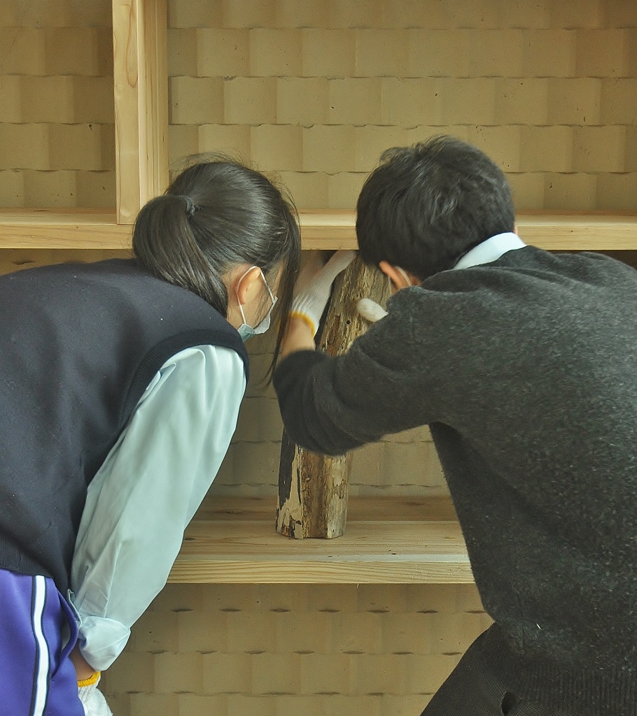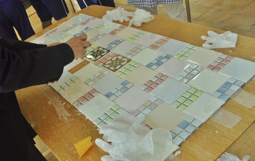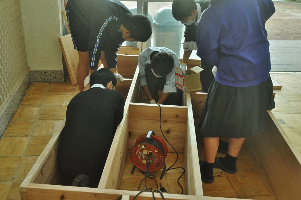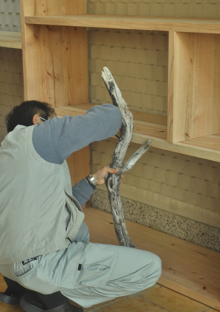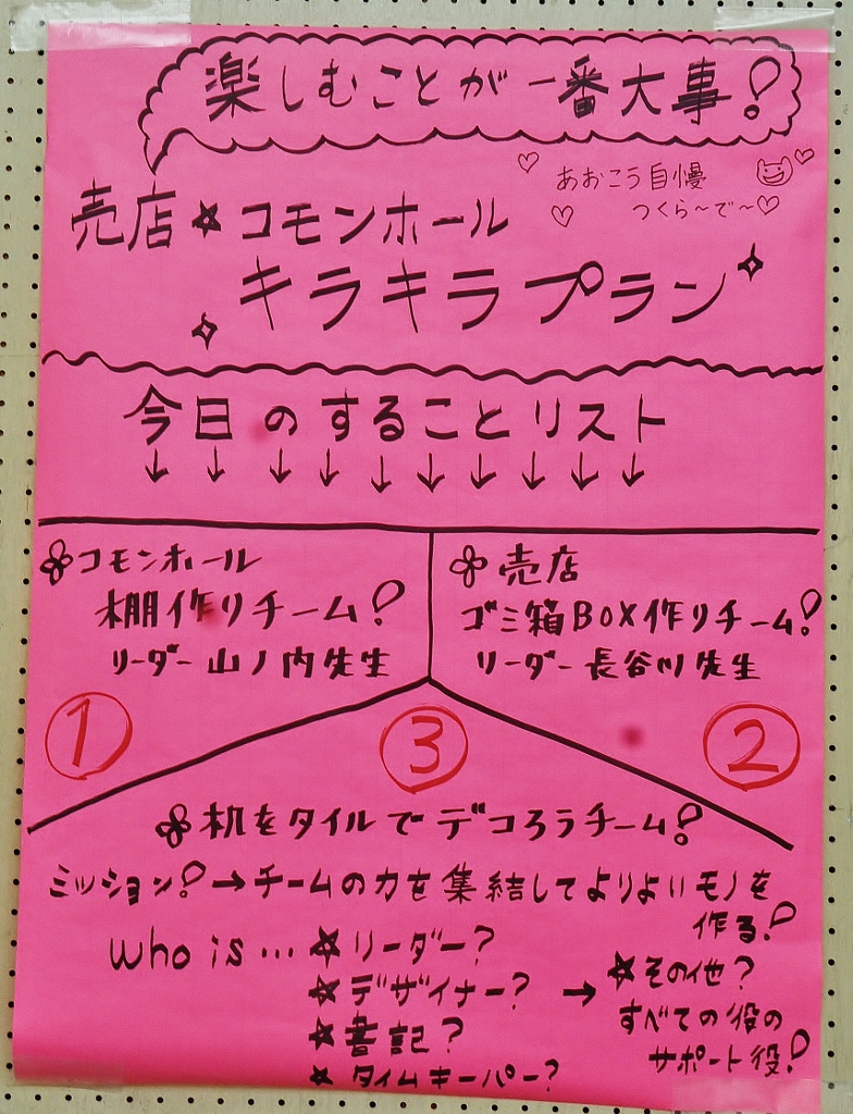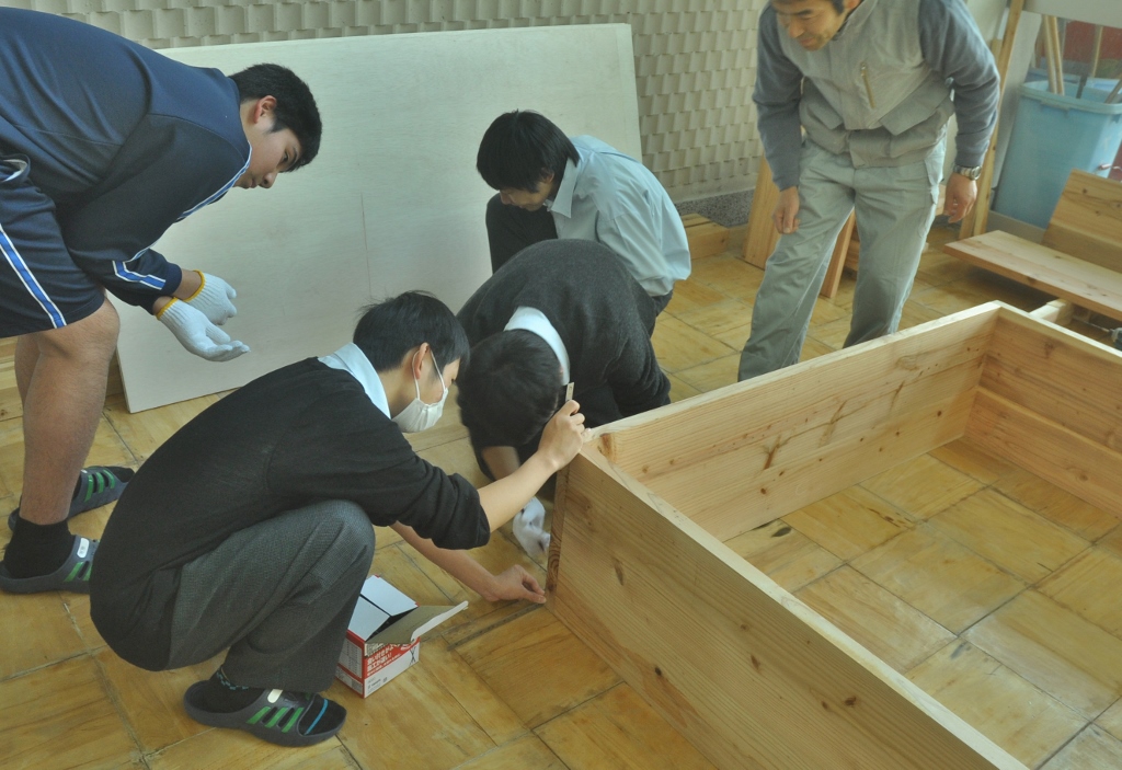 < Highschool cafe project >again コメントを残す *この夏中断していた校内コモンホールのリノベーションが再開。 集まった20人位の生徒が3つのセクションに分かれ、男子4名とあらかじめ用意した部材で本棚を組み立て、壁側に設置する。 春に近くの海岸から集めていた流木をしきい代わりに立てる時は皆がワッと寄って来て盛り上がり、手に取って遊び出す。これで一気にオシャレな棚に変身する。 他に既存のテーブルにカラフルなタイル張りでデコレート、そして売店のゴミ箱のカバーを制作(未完). 皆の手で作られていく空間の匂いがし始めてきた。 (来月に続く