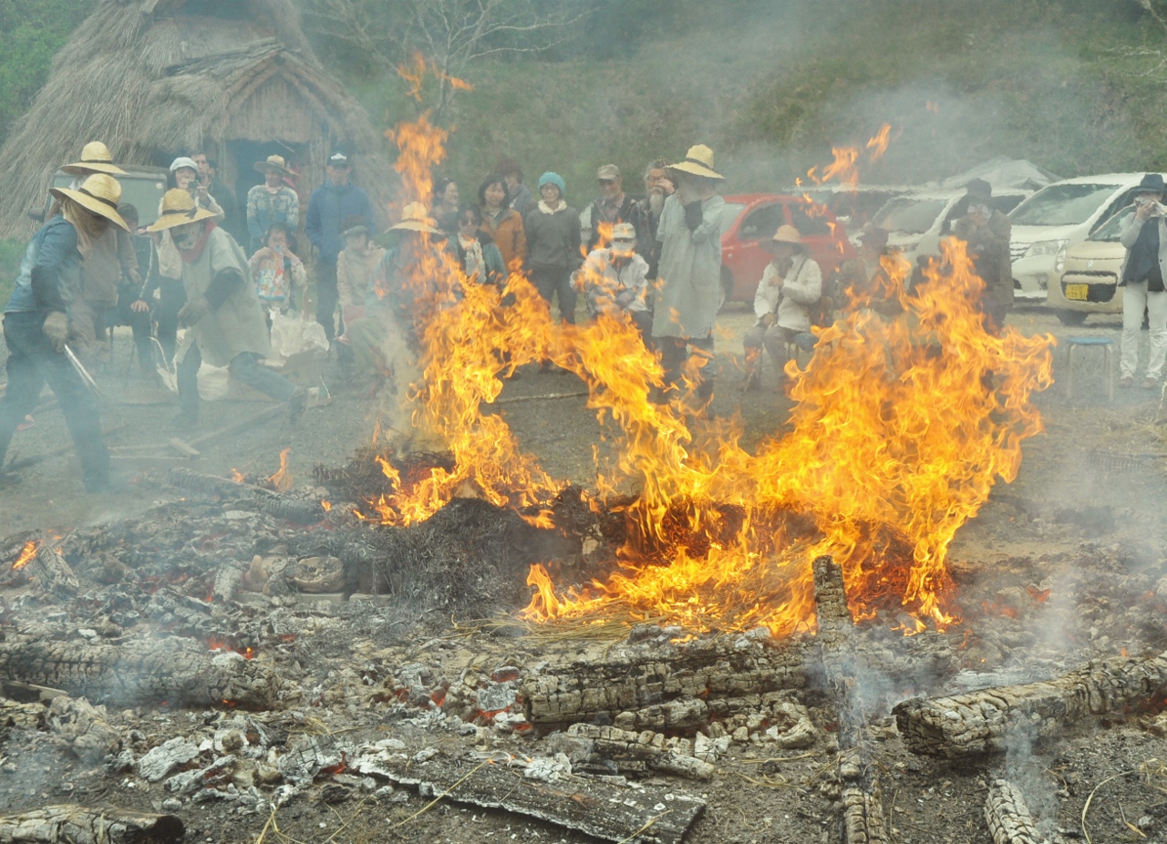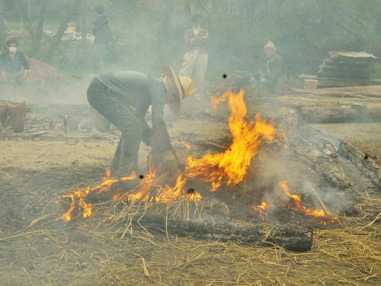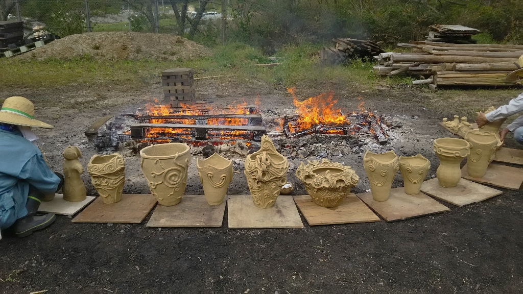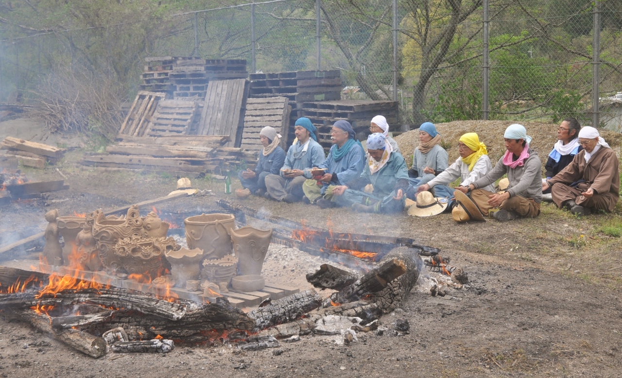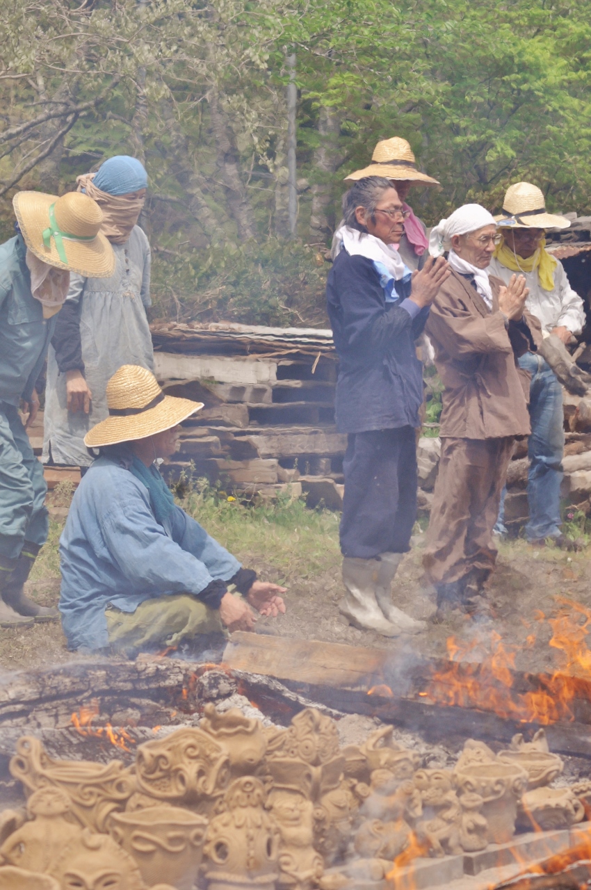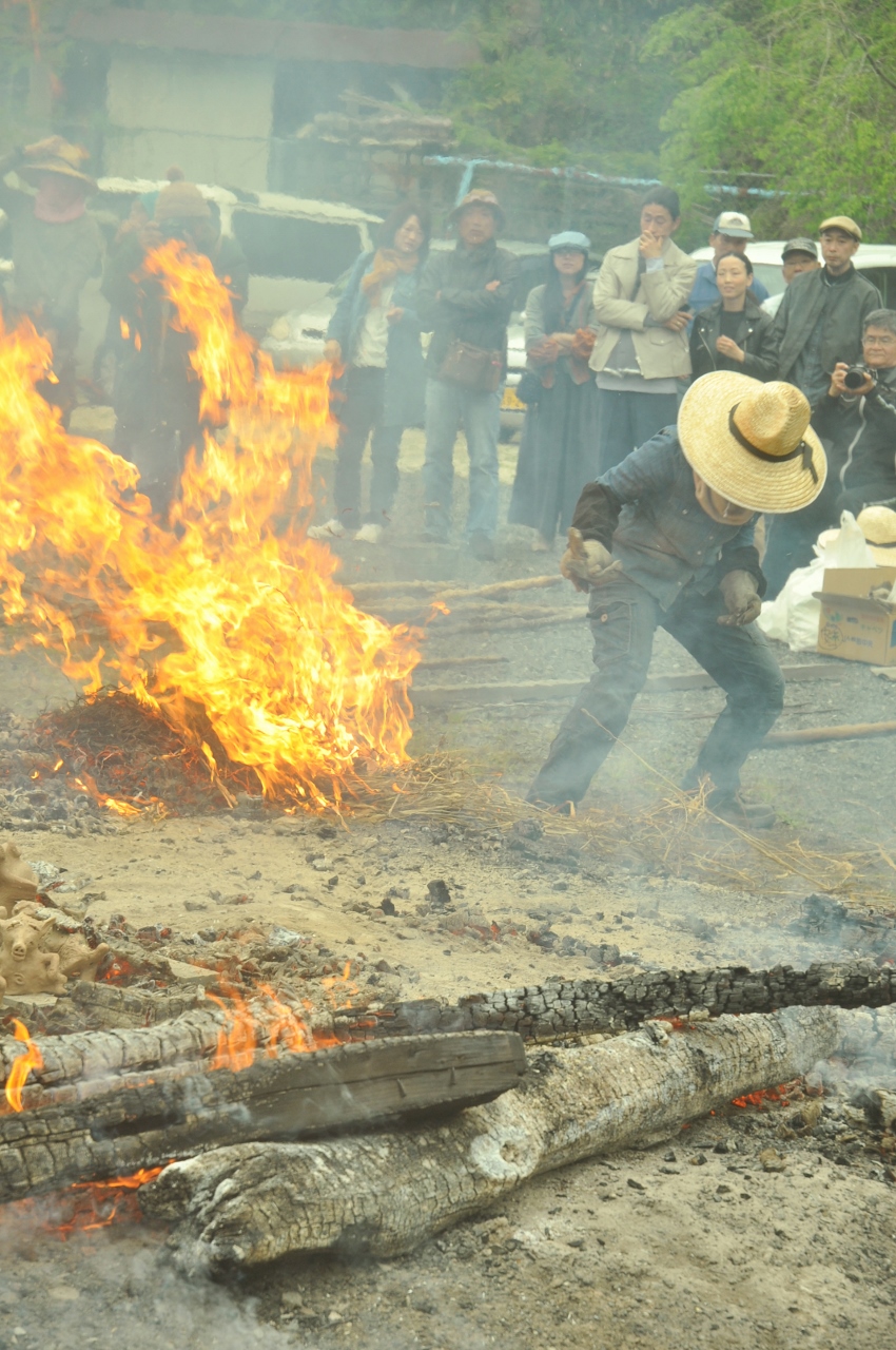 4/28 『縄文野焼き祭り』 猪風来美術館(岡山県新見市) コメントを残す *毎年春と秋に開催される猪風来美術館での縄文土器の野焼き。 縄文の炎を燃やし続けてきた猪風来氏を祭司として、男と女に分かれて今回のために作った土器の作者たちの手で古材の薪が周囲にくべられてゆき、大いなる炎に土器たちが包まれていく。 皆の注視の中、焼かれていく土器たちは赤子のように炎の子宮から生まれ出て来た。
