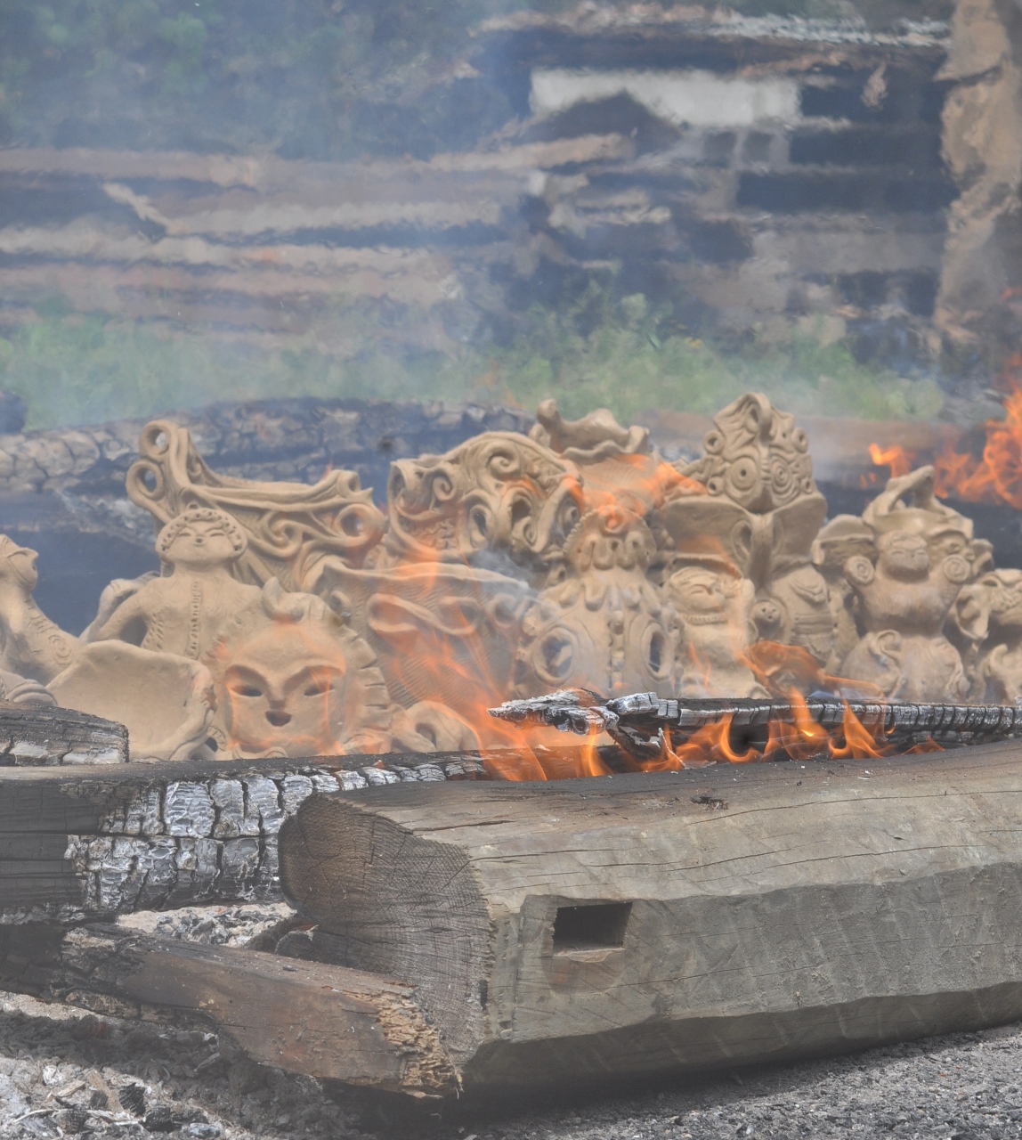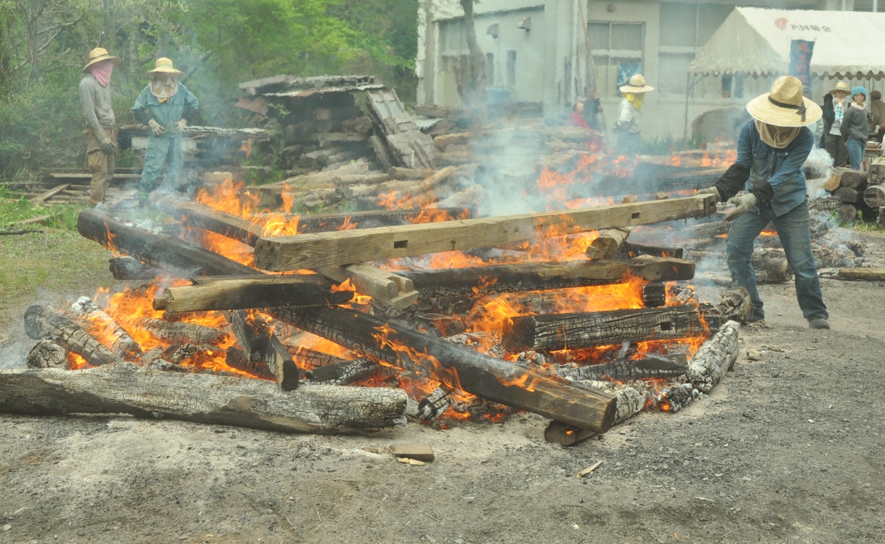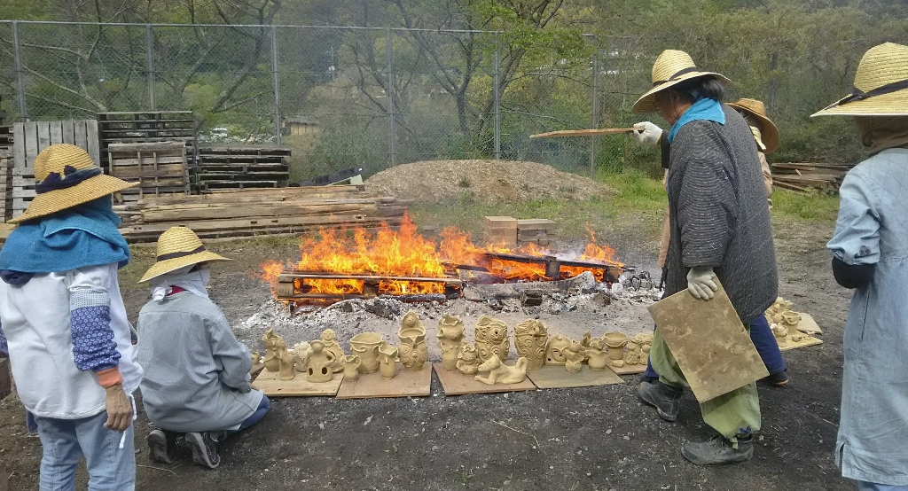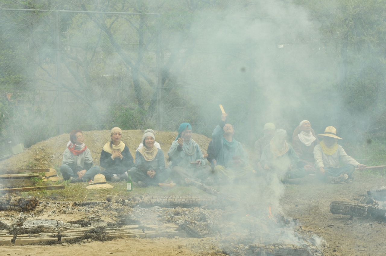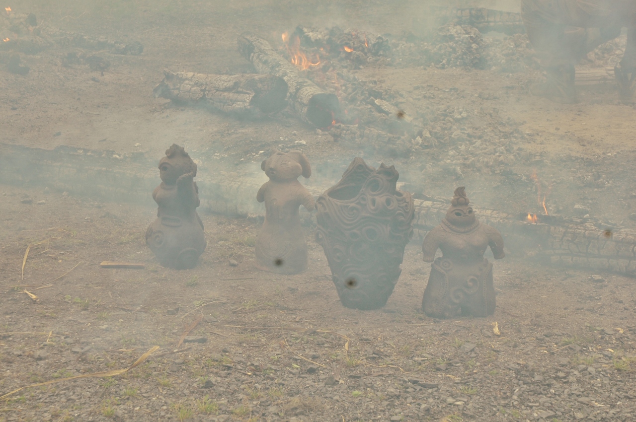 4/28 『縄文野焼き祭り』 猪風来美術館(岡山県新見市) コメントを残す *毎年春と秋に開催される猪風来美術館での縄文土器の野焼き。 縄文の炎を燃やし続けてきた猪風来氏を祭司として、男と女に分かれて今回のために作った土器の作者たちの手で古材の薪が周囲にくべられてゆき、大いなる炎に土器たちが包まれていく。 皆の注視の中、焼かれていく土器たちは赤子のように炎の子宮から生まれ出て来た。