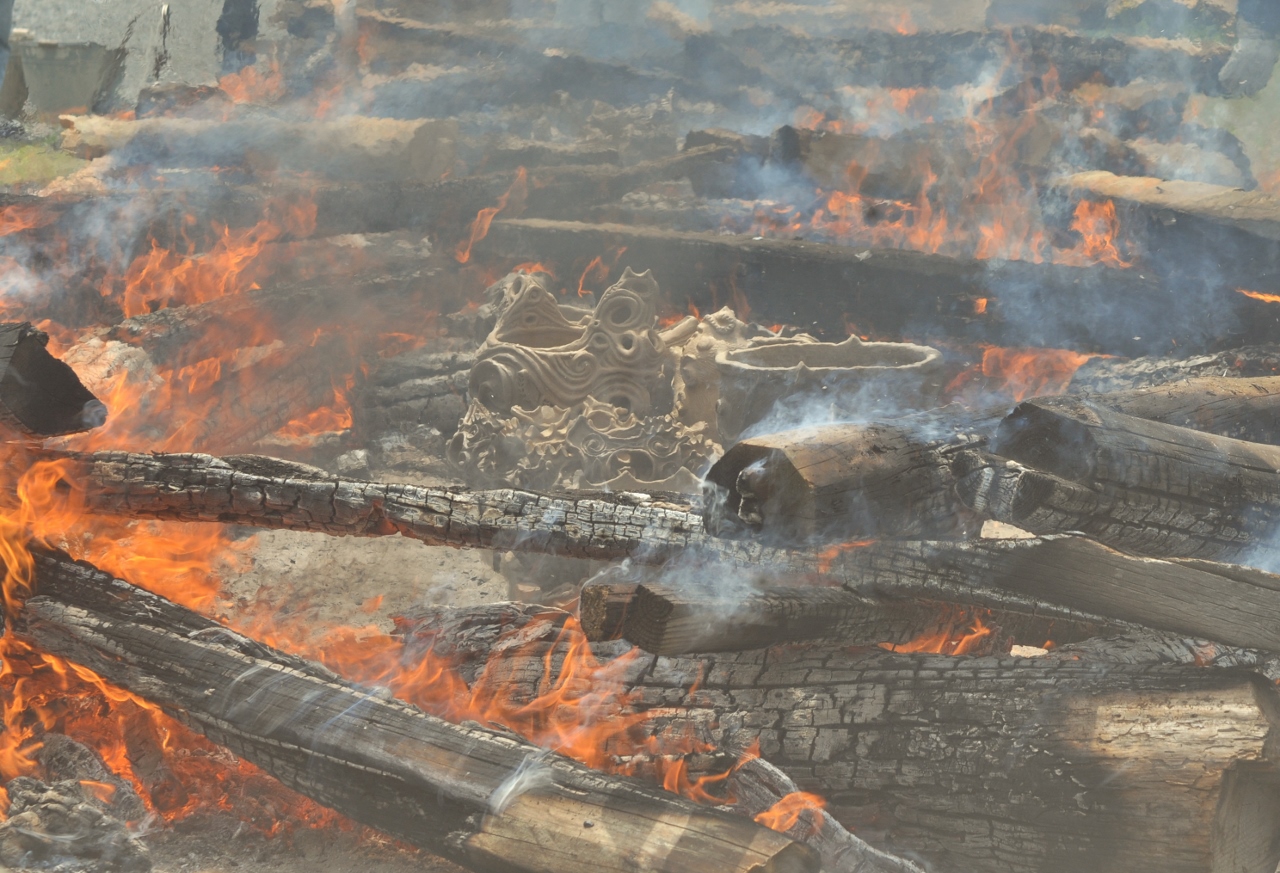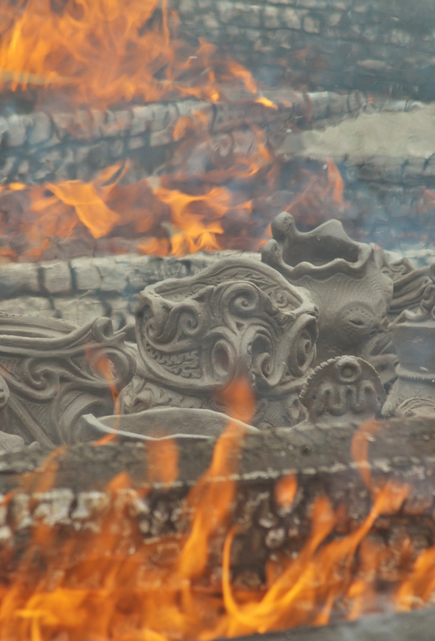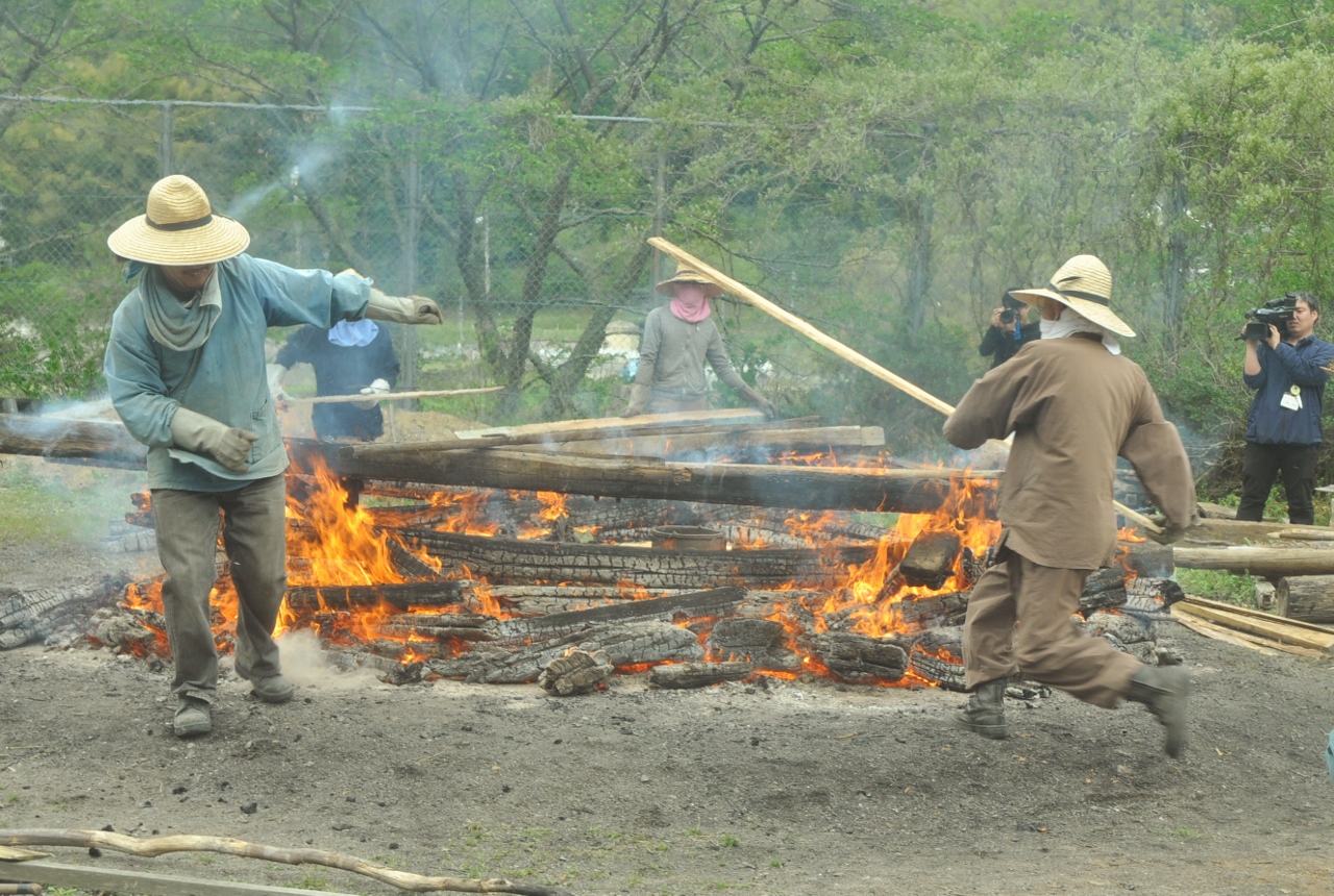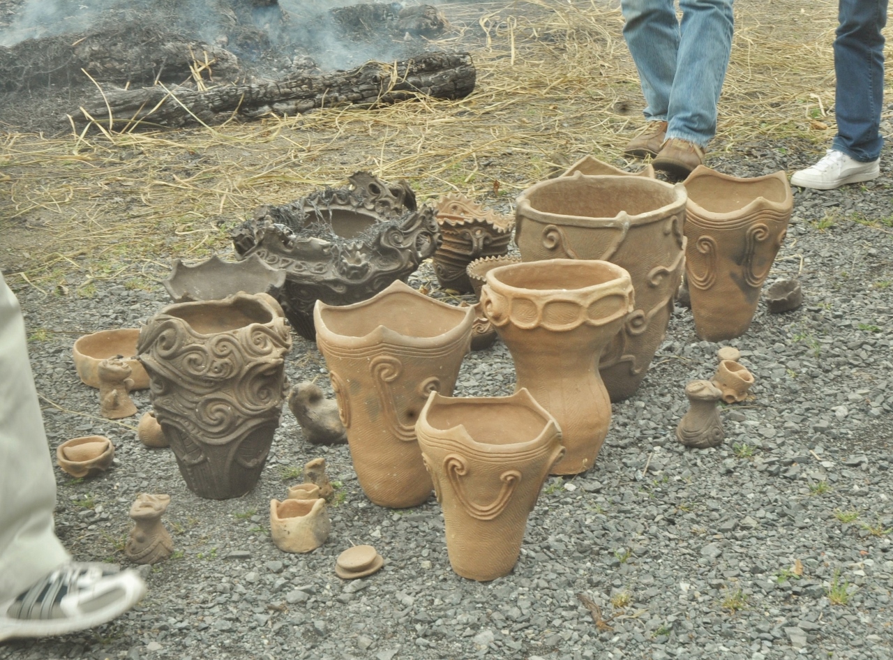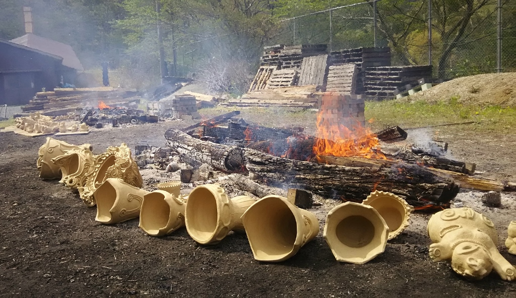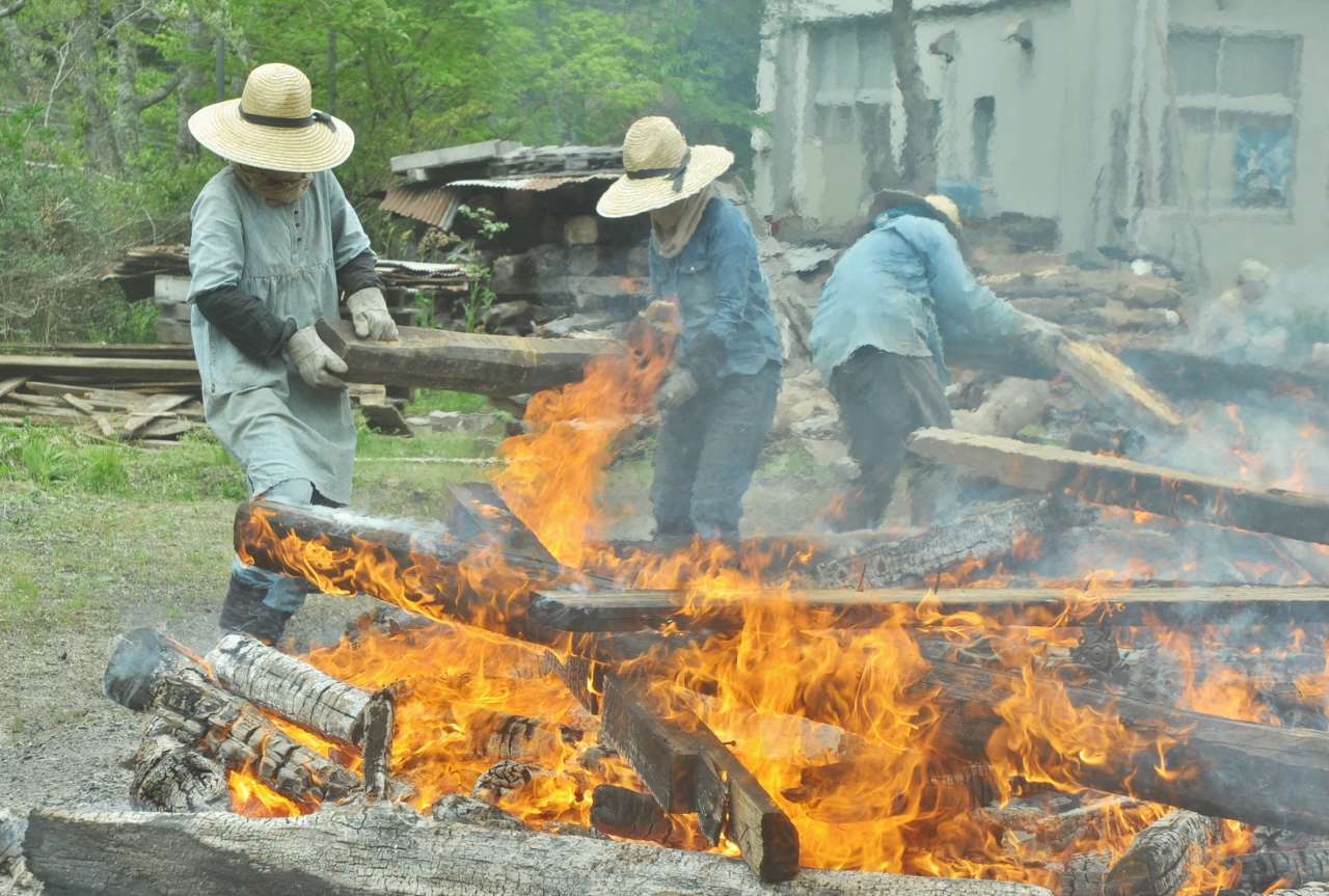 4/28 『縄文野焼き祭り』 猪風来美術館(岡山県新見市) コメントを残す *毎年春と秋に開催される猪風来美術館での縄文土器の野焼き。 縄文の炎を燃やし続けてきた猪風来氏を祭司として、男と女に分かれて今回のために作った土器の作者たちの手で古材の薪が周囲にくべられてゆき、大いなる炎に土器たちが包まれていく。 皆の注視の中、焼かれていく土器たちは赤子のように炎の子宮から生まれ出て来た。
