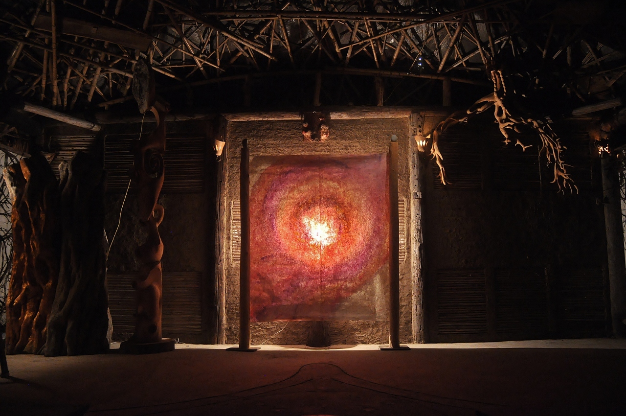 *あまはれの光、天頂より差し込むドーム内部、新月の始まる10:57より入手から二年の封印を解かれ、始めて外に持ち出された<マザームーンクリスタルボウル>の演奏が、十人の参加者の見守る中始められる。
