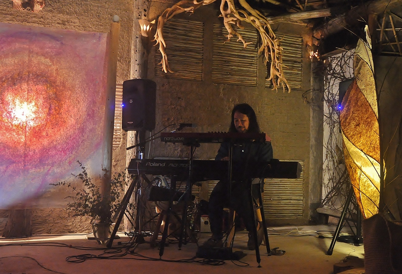 ギャラリーで祝いの赤飯を口にした後、自分の希望で半地下の泥のドーム、<ドローム>でも小さいボウルを中央に据え音を響かせると、やはり心地よく音が回る。