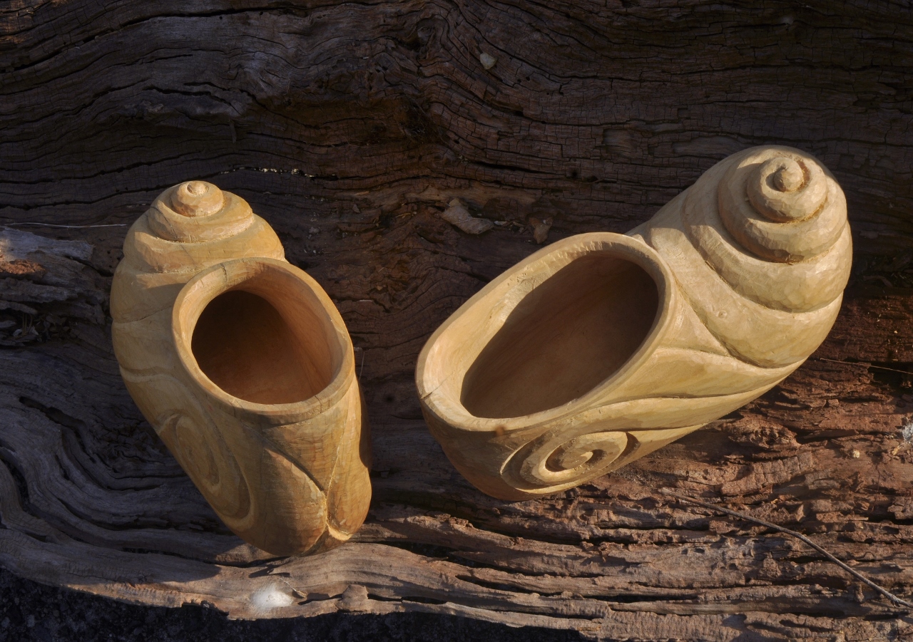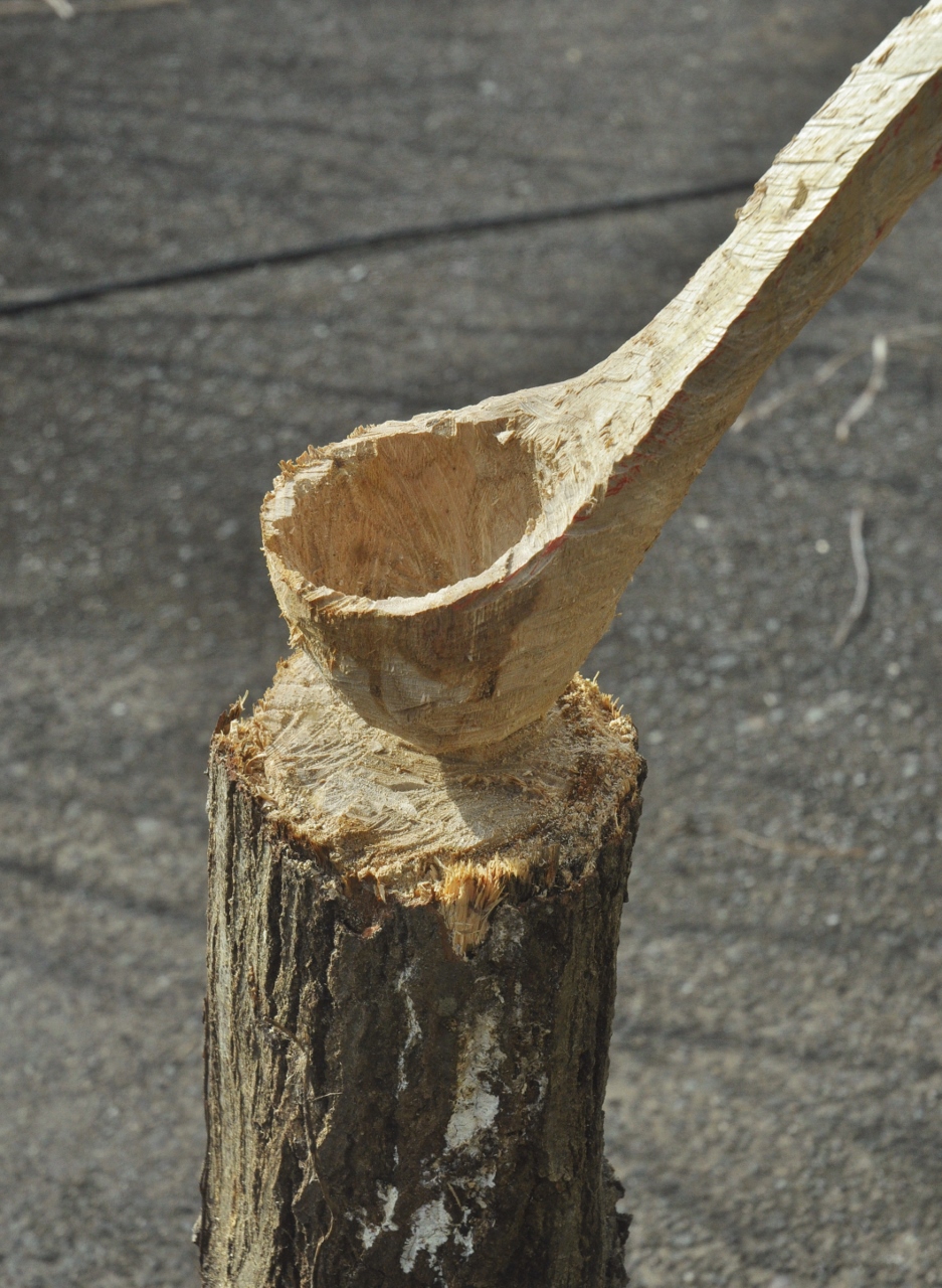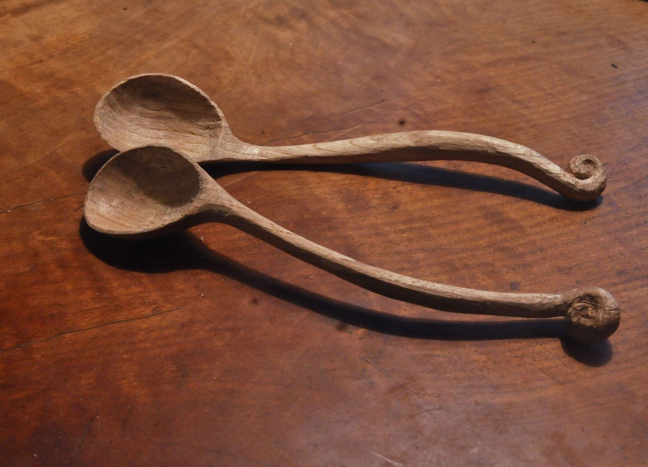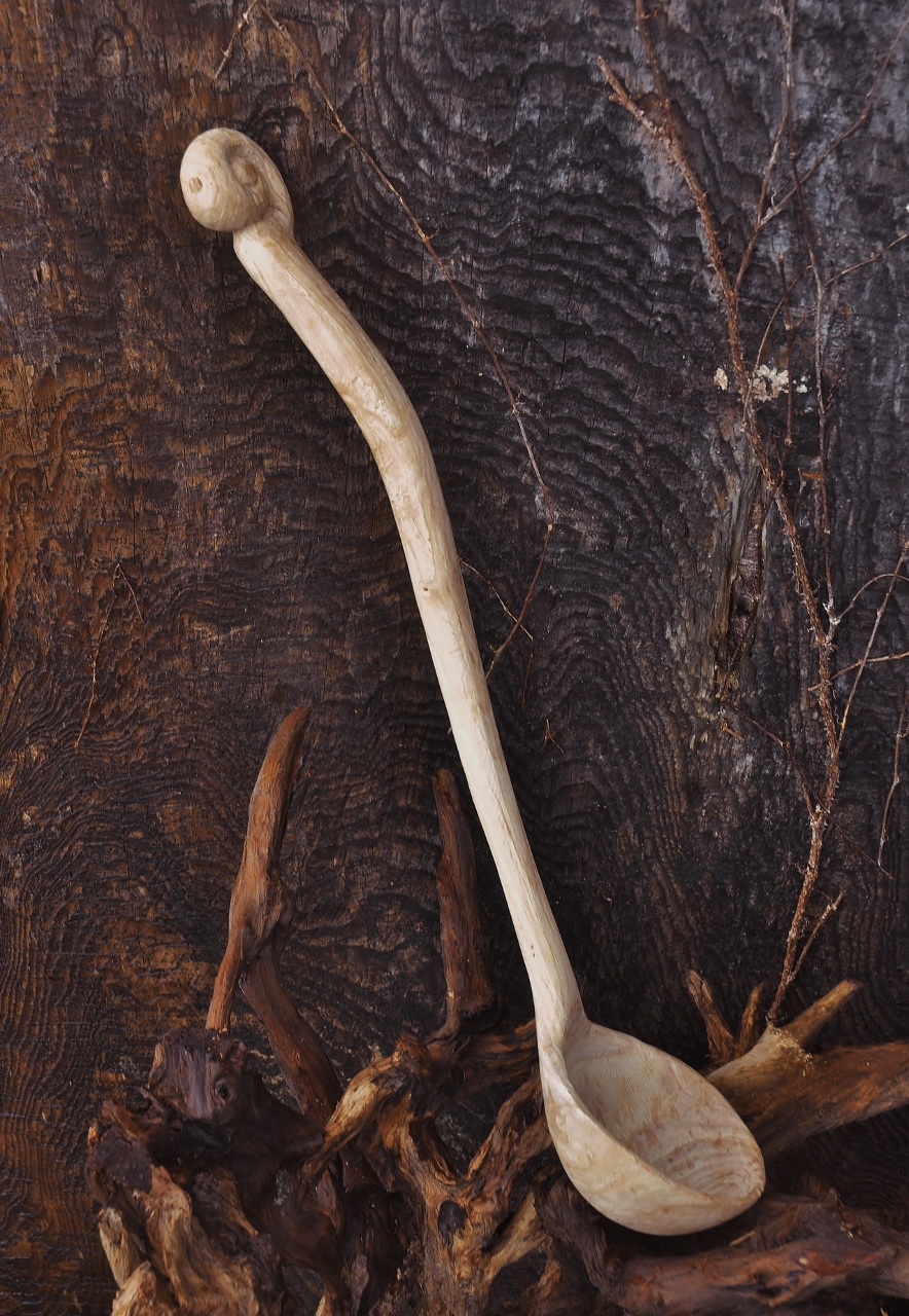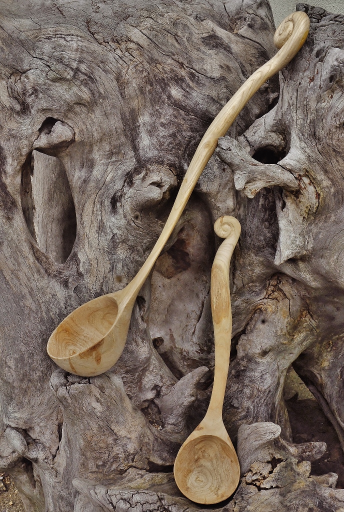 *深さのある縄文土器のための長い柄のお玉を一本の太い枝から削り出す。その端材で左右使いのスプーンを一組。 〈渦〉は縄文のシンボル。
