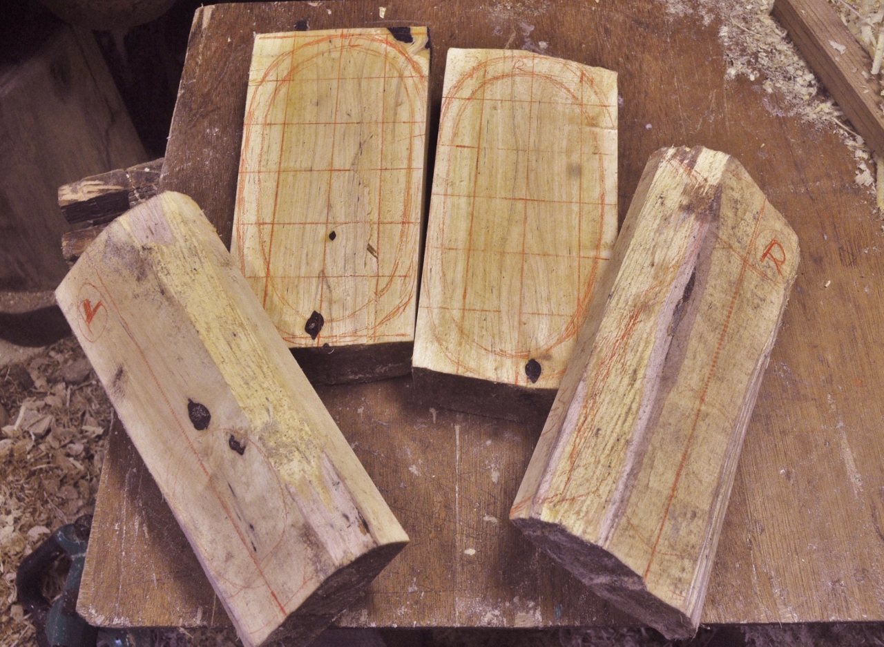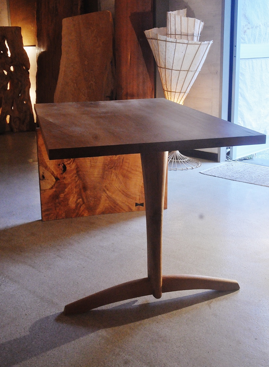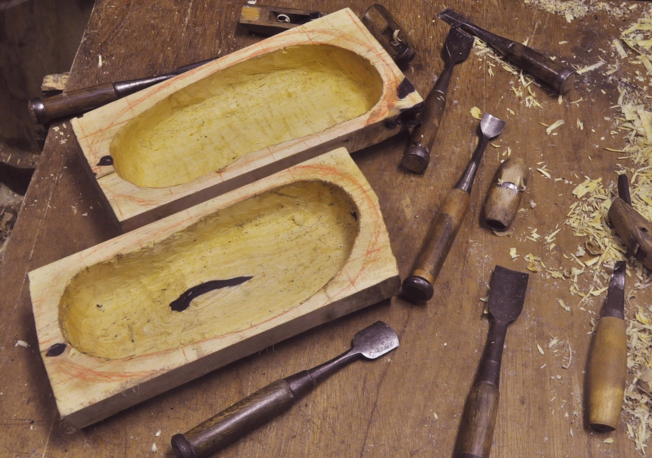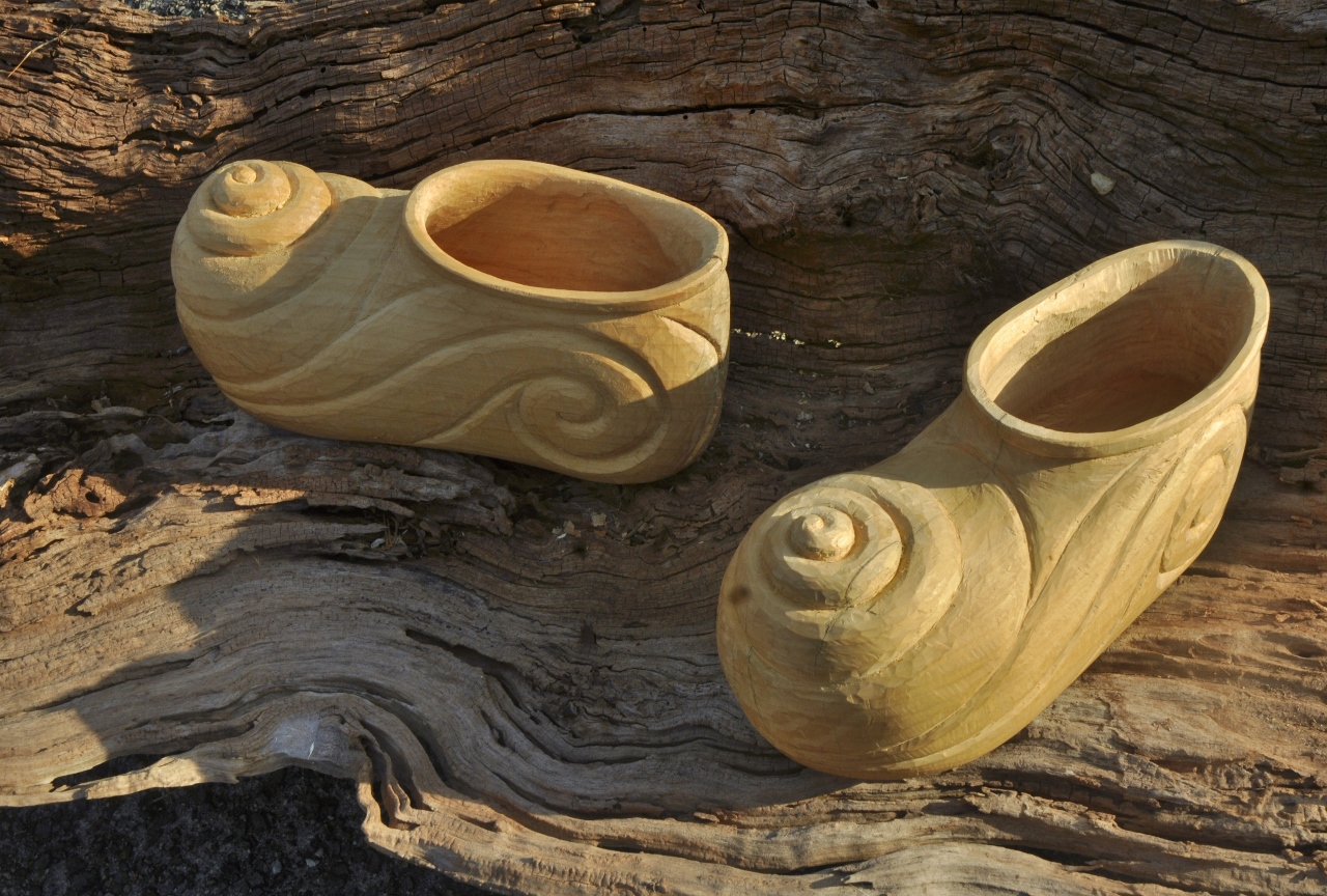 *深さのある縄文土器のための長い柄のお玉を一本の太い枝から削り出す。その端材で左右使いのスプーンを一組。 〈渦〉は縄文のシンボル。