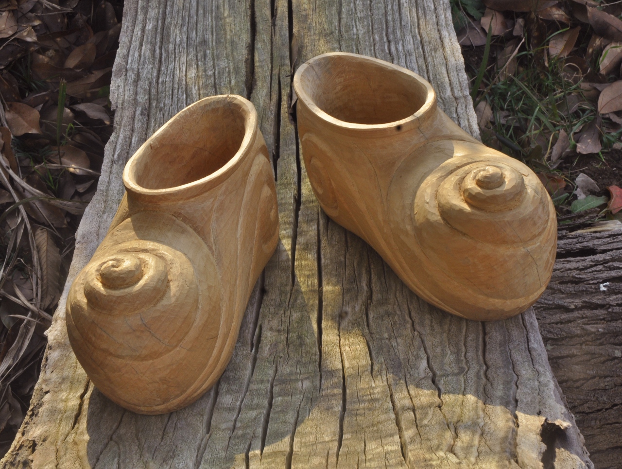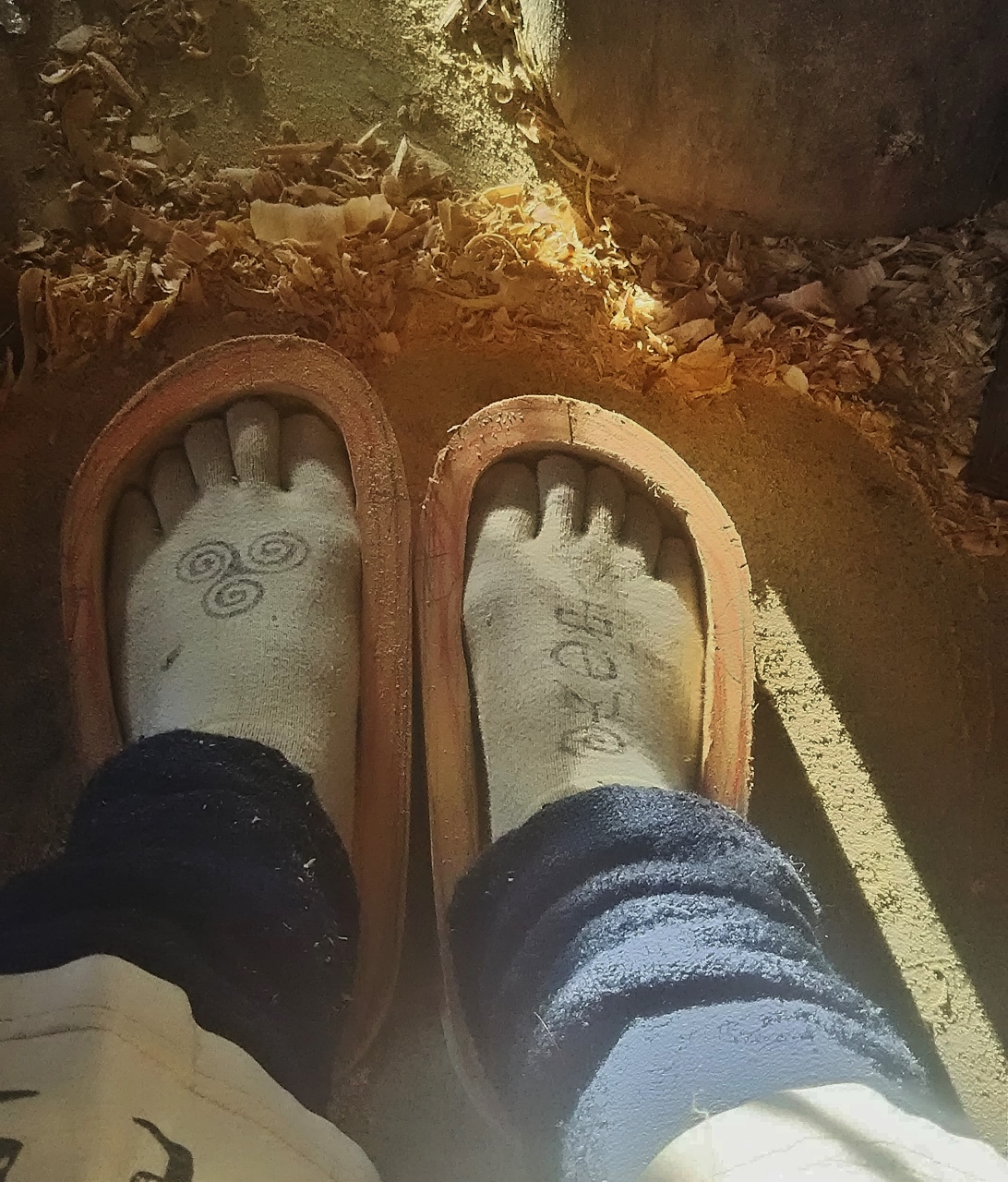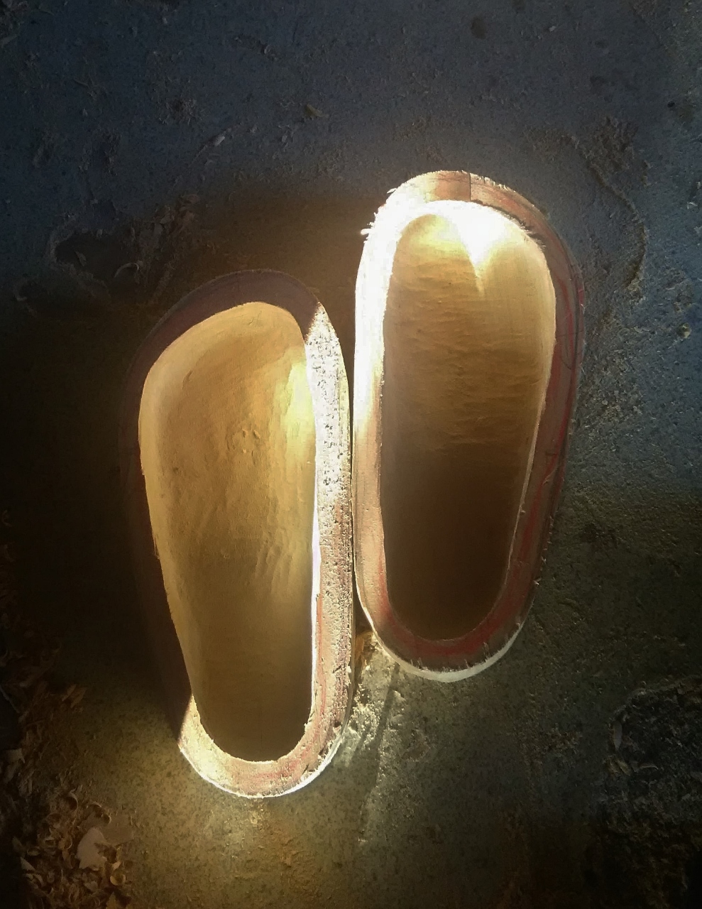 *足湯桶で感じた木の保温性を確かめるために、2日前に伐った柿の枝で木靴を作る。 部屋で使いながら乾燥させて、上下を接着する。
