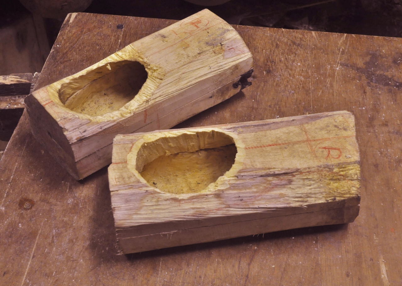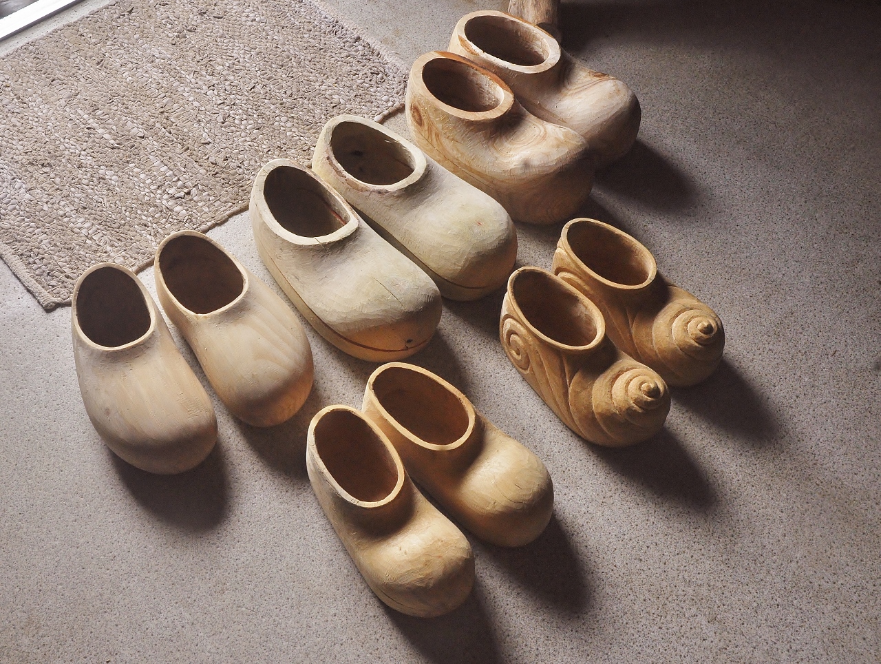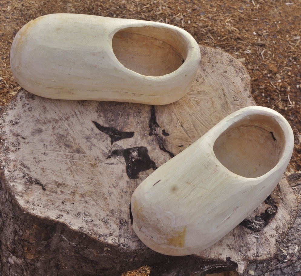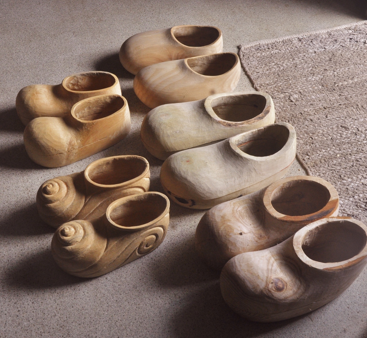 *足湯桶で感じた木の保温性を確かめるために、2日前に伐った柿の枝で木靴を作る。 部屋で使いながら乾燥させて、上下を接着する。