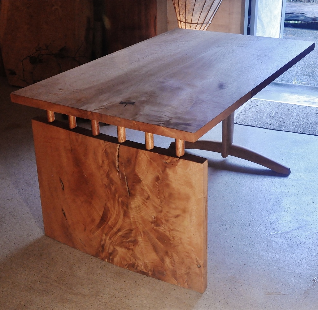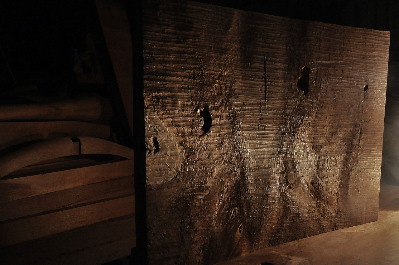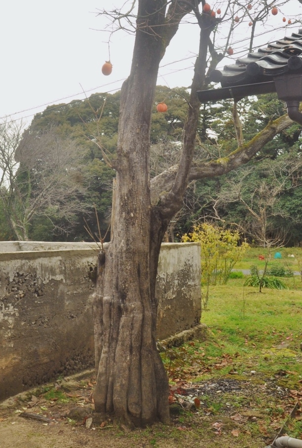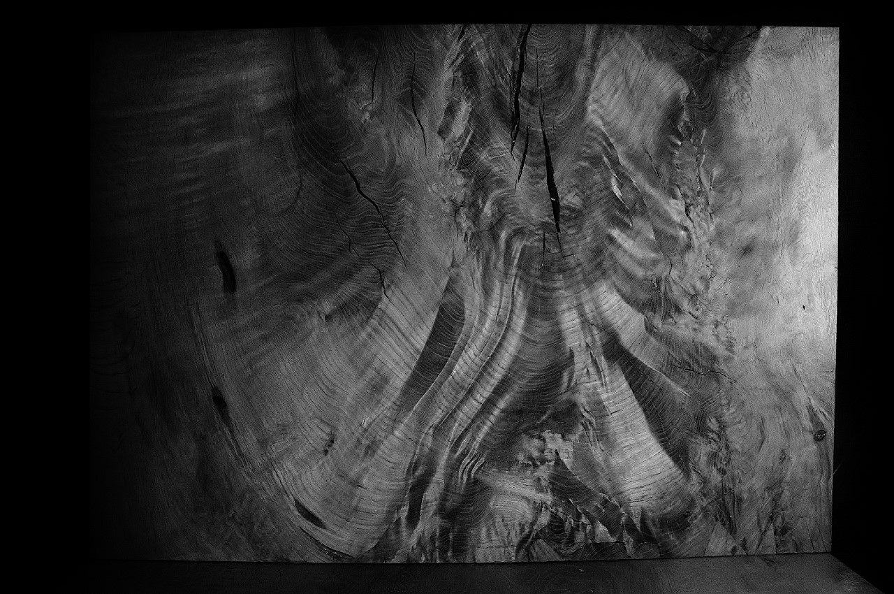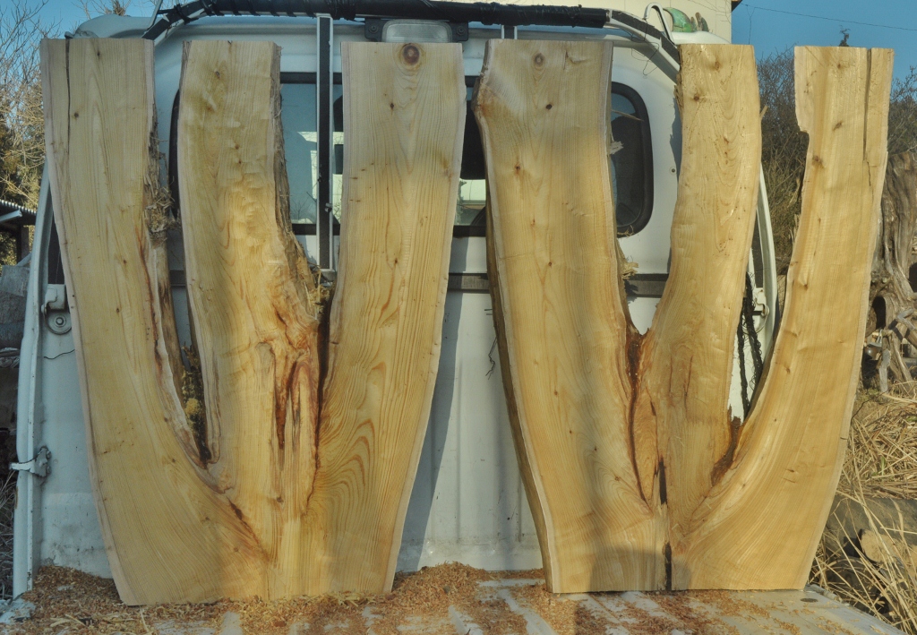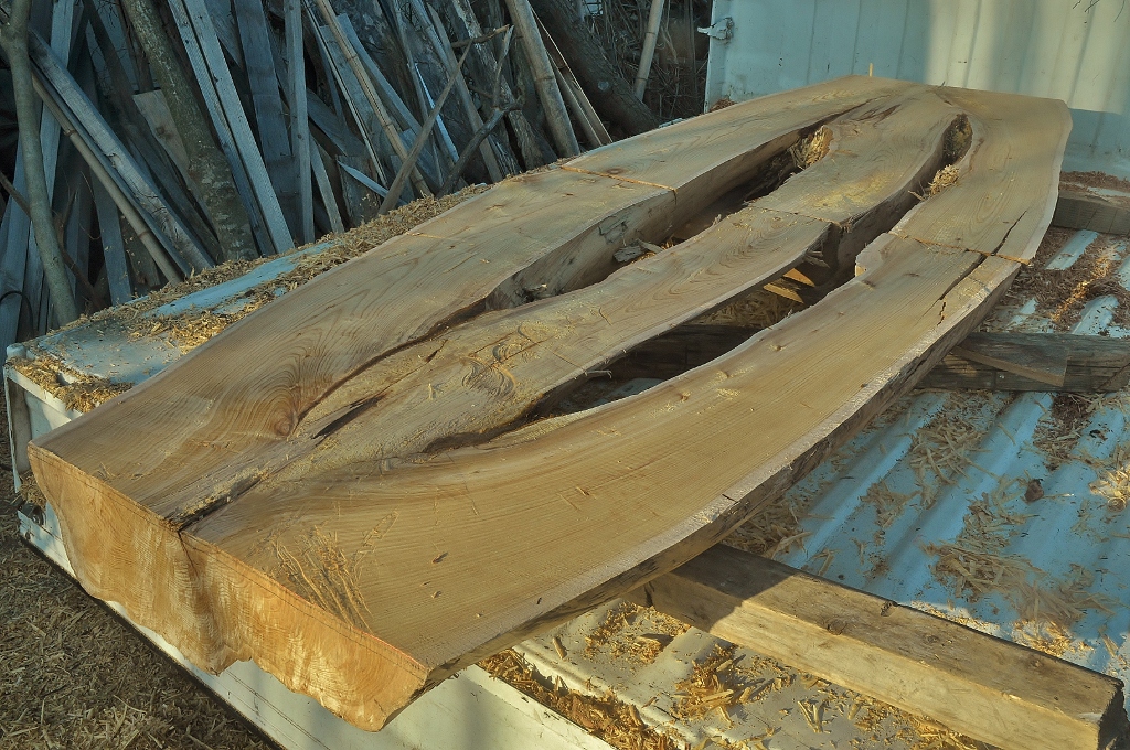 *昨年末、南部町で伐った樹齢100年の西条柿の根株、その高く入った入皮を活かすテーブルに加工する。