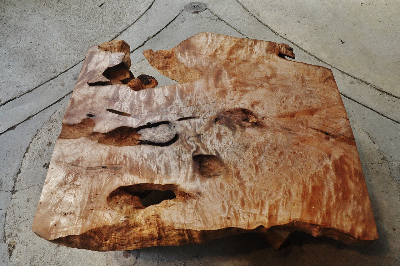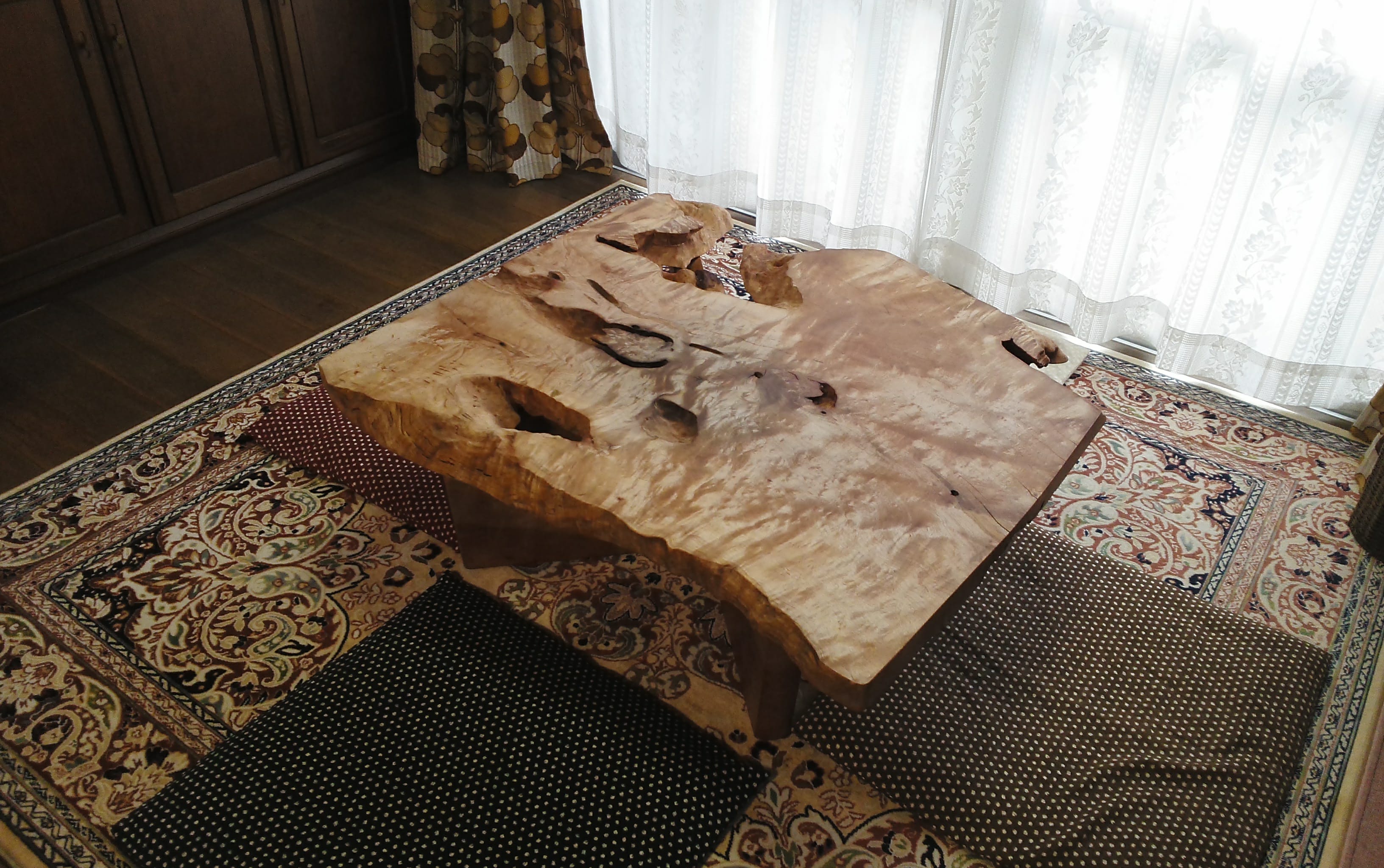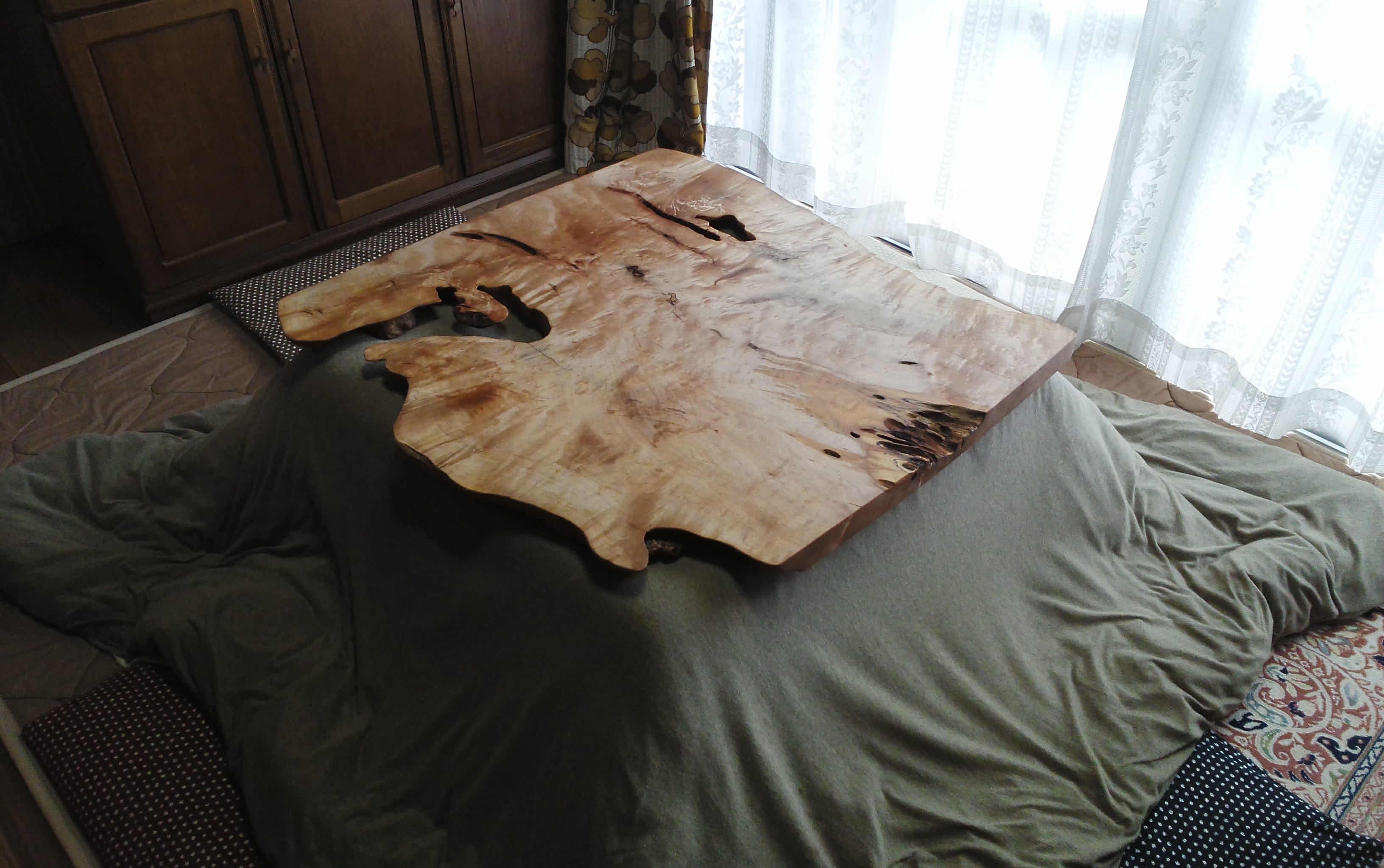 <カエデローテーブル>order・・・・ コメントを残す *幅80以上ある大きなカエデをコタツ板にも使えるように木取り、両面仕上げる。 その入り皮の表情は面白く、エゴマオイルで塗装すると、木の深みに入ってゆく。
