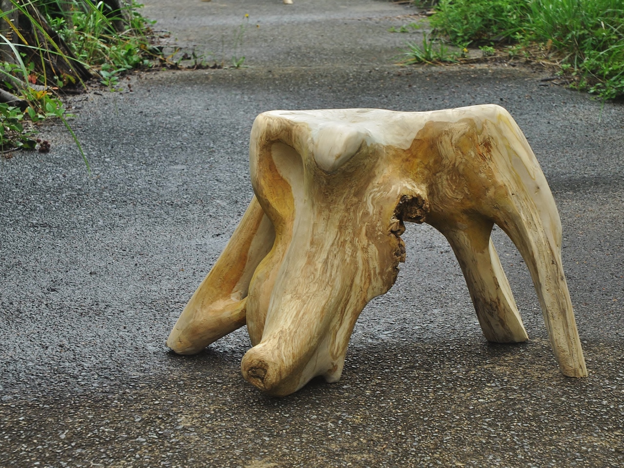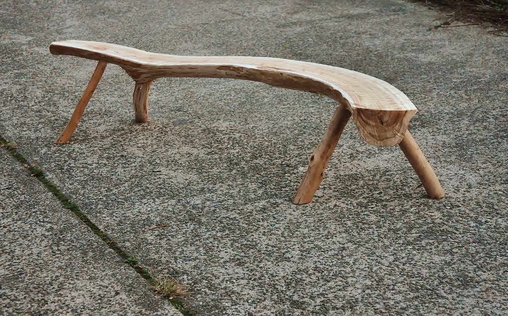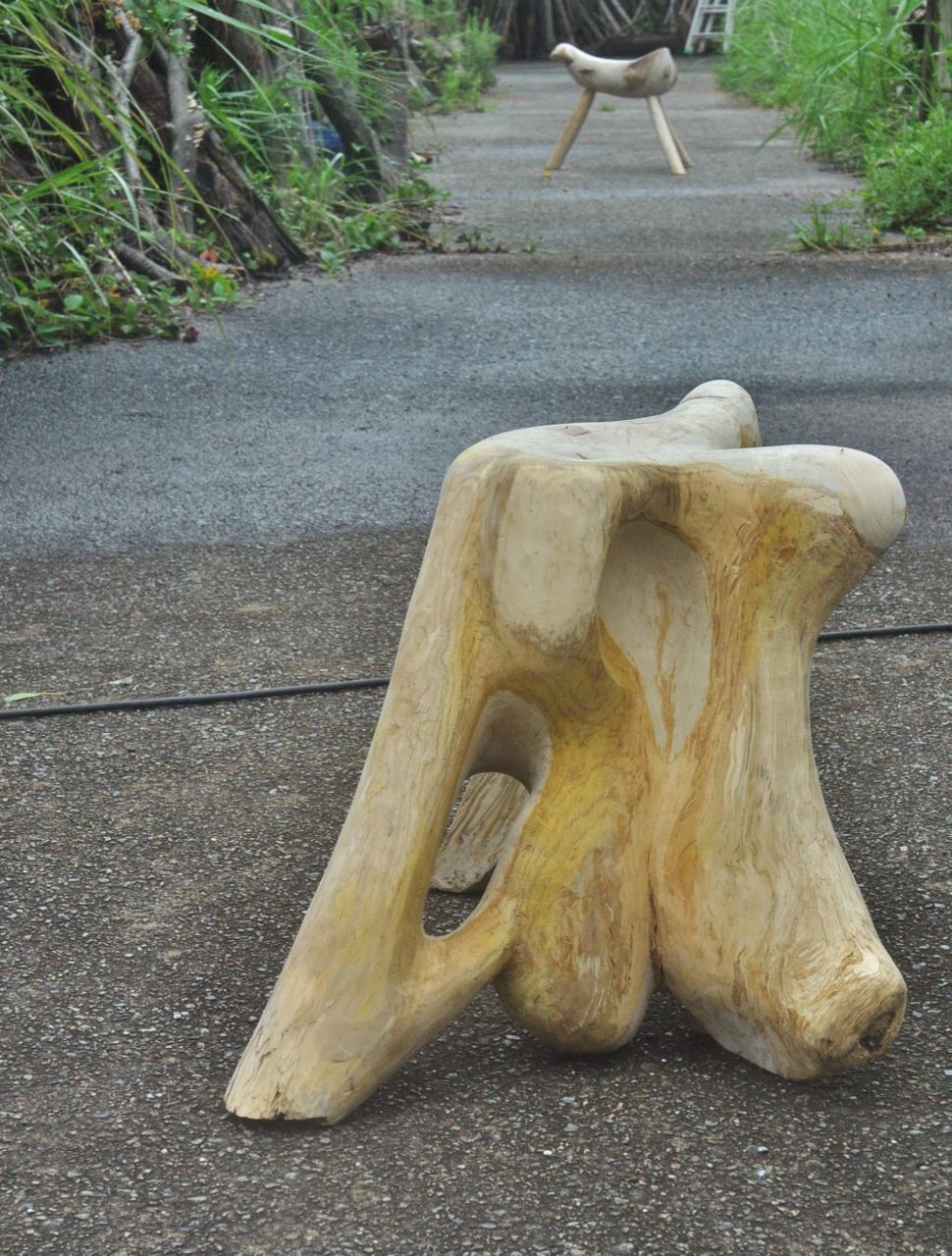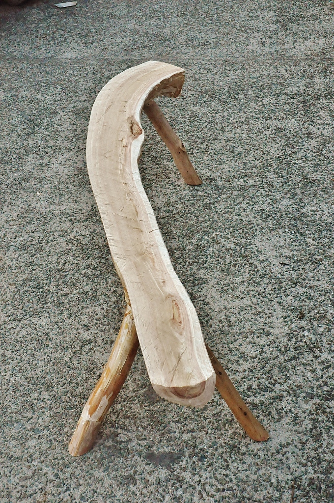 <クリのベンチ>order W170 コメントを残す *二股の根株を半割にして両サイドに使った三人掛けのベンチ、 外側のチジミが綺麗に浮かび出る. (前後に揺れるロッキングにしたらさぞ気持ちいいだろう)