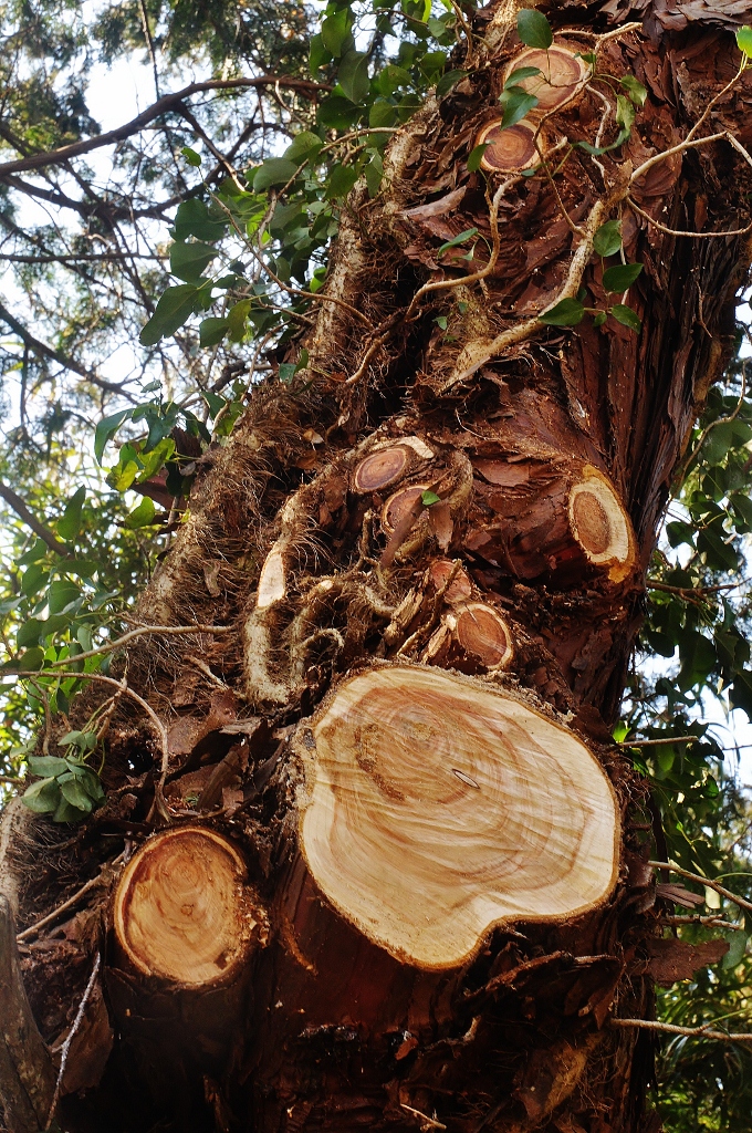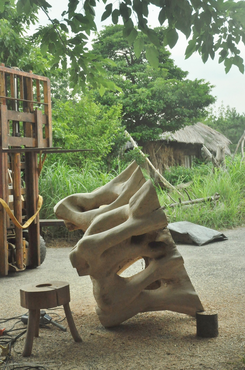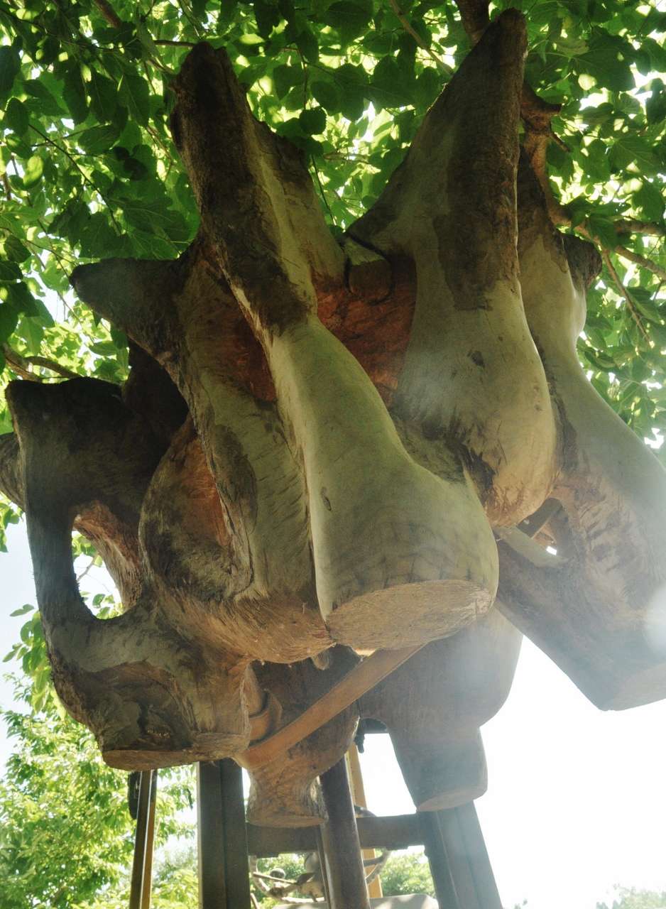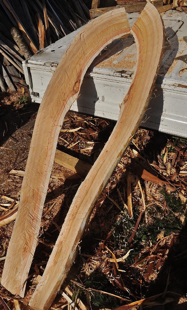 <アスナロガーデンテーブル》orderⅠ・・・ コメントを残す *材にならない三又のアスナロを製材所からもらい受け、半割にして天板に仕込む。 そしてやはり切り捨てられた幹上の柱脚と、庭木だったサクラ二股の太枝を組み合わせて荒組みする。